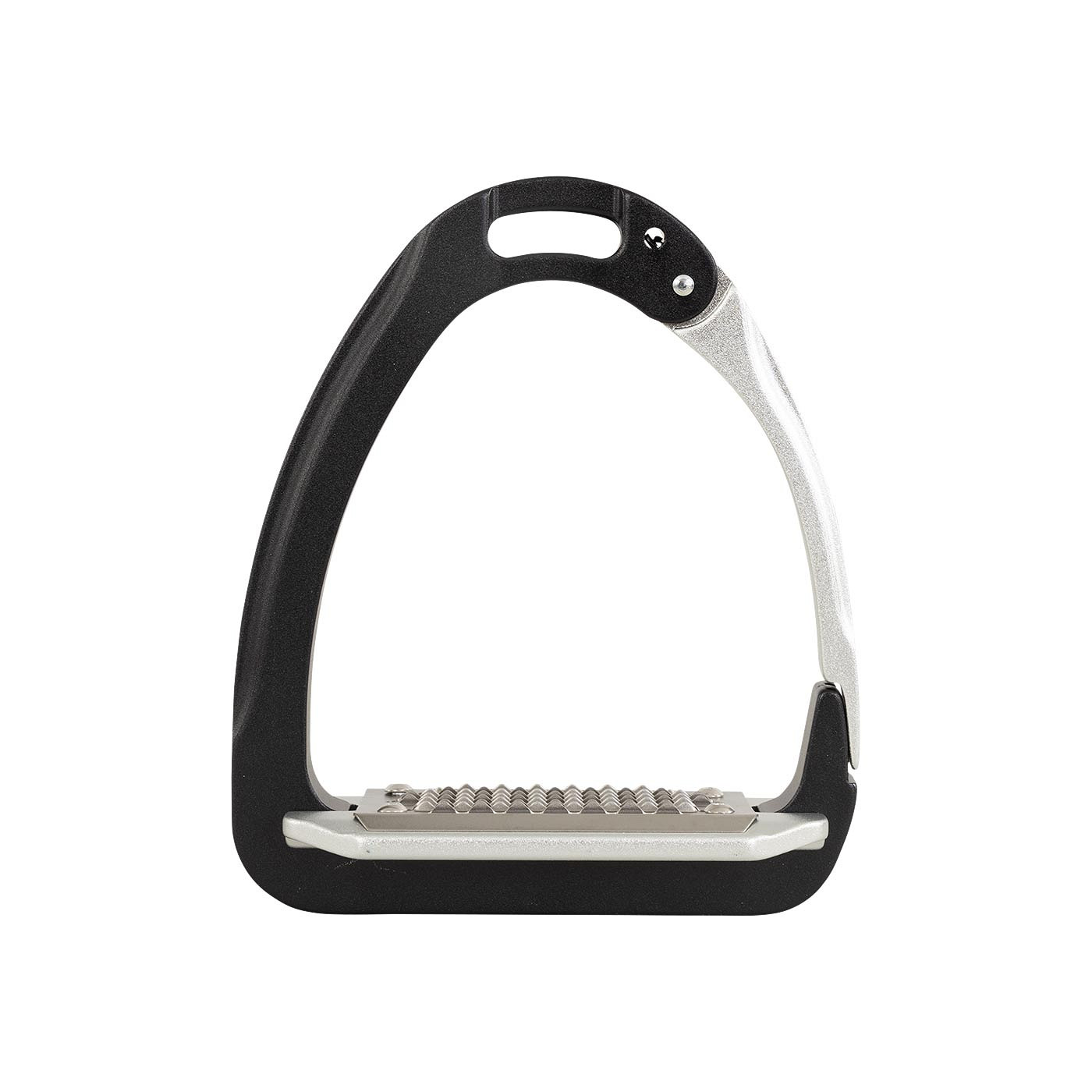 The wide, stainless steel, anti-slip tread features extra-long holes to avoid dirt accumulations between the boot sole and the tread. The tread is slightly angled, to keep the heel down. The bevelled opening for the stirrup leather ensures a good stirrup position, keeping the foot in the correct position. This gives the rider more stability and improves the leg position.