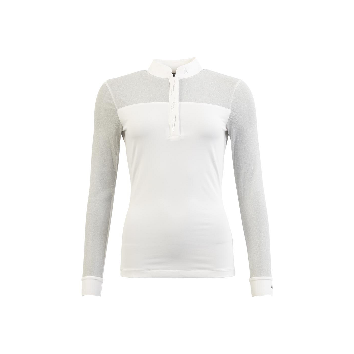Väga elegantne võistluspluus, mis paistab silma pehme veniva kanga ja sädeleva võrkkanga kombinatsiooniga. Võrkkangas tagab suurepärase hingavuse ning õrn sädelus lisab pluusile pilkupüüdva ja luksusliku ilme — ideaalne valik, kui soovid võistlusareenil silma paista.