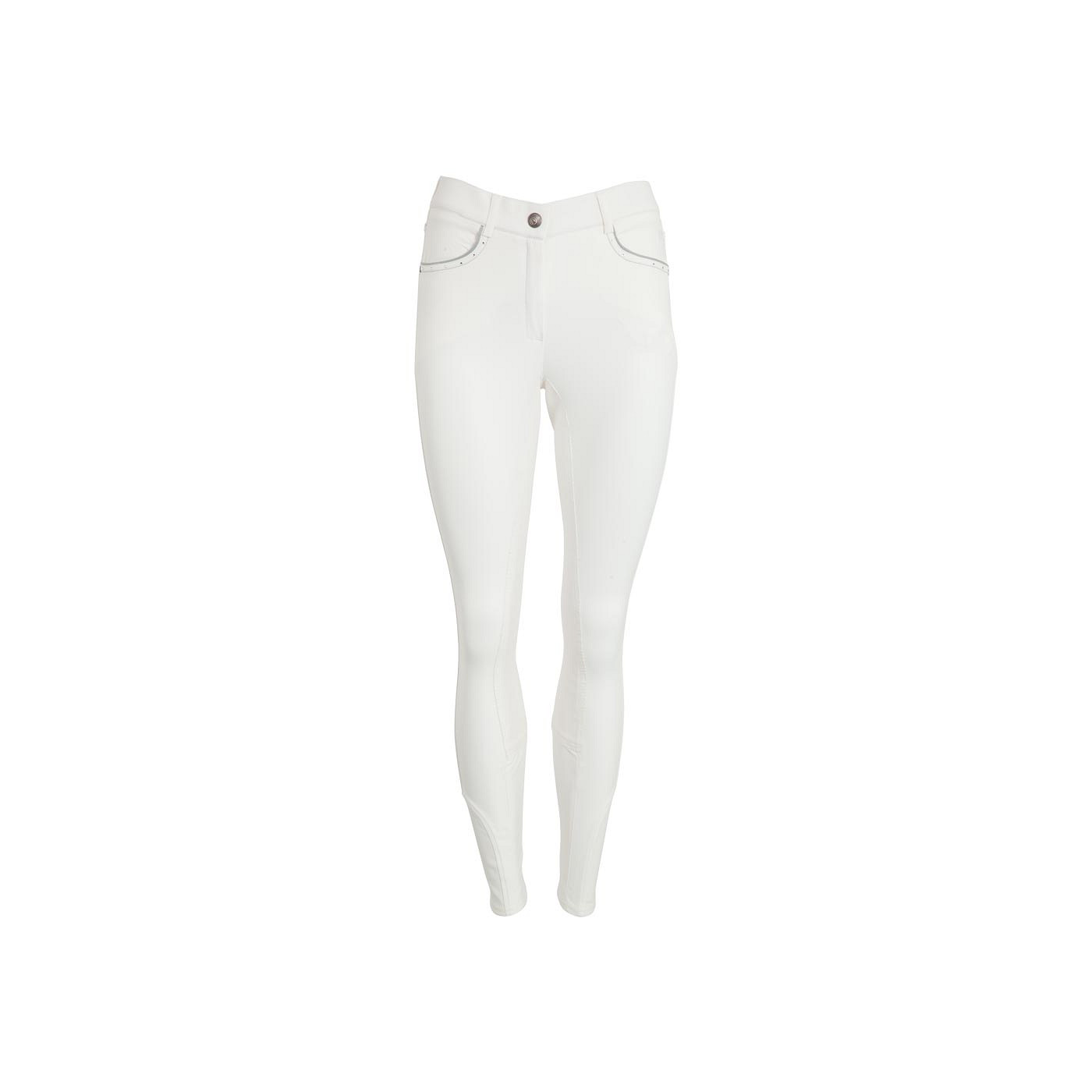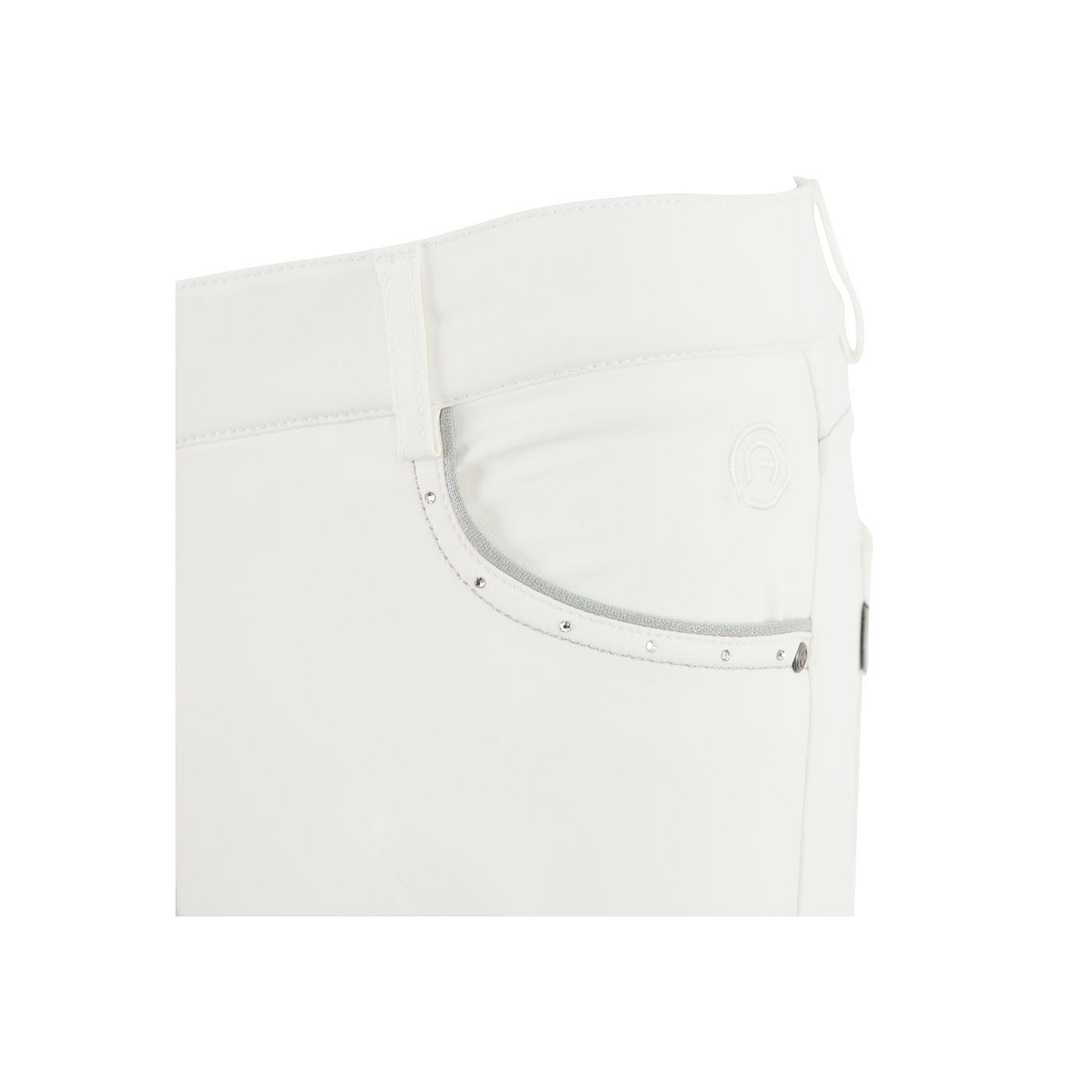 Other benefits of Aqua-X are its water and dirt repellent effect and its protective function against UV radiation. This model of the ANKY® riding breeches Decorated has a ¾ Clarino seat. The slim fit breeches have jeans pockets at the front and patch pockets at the back. The pockets are stylishly decorated with shiny piping, silver stitching and small imitation diamonds for a touch of elegance. The breeches have a comfortable waistband with belt loops. The lower part of the leg is made of knitted Lycra, which allows for a snug fit around the ankle.