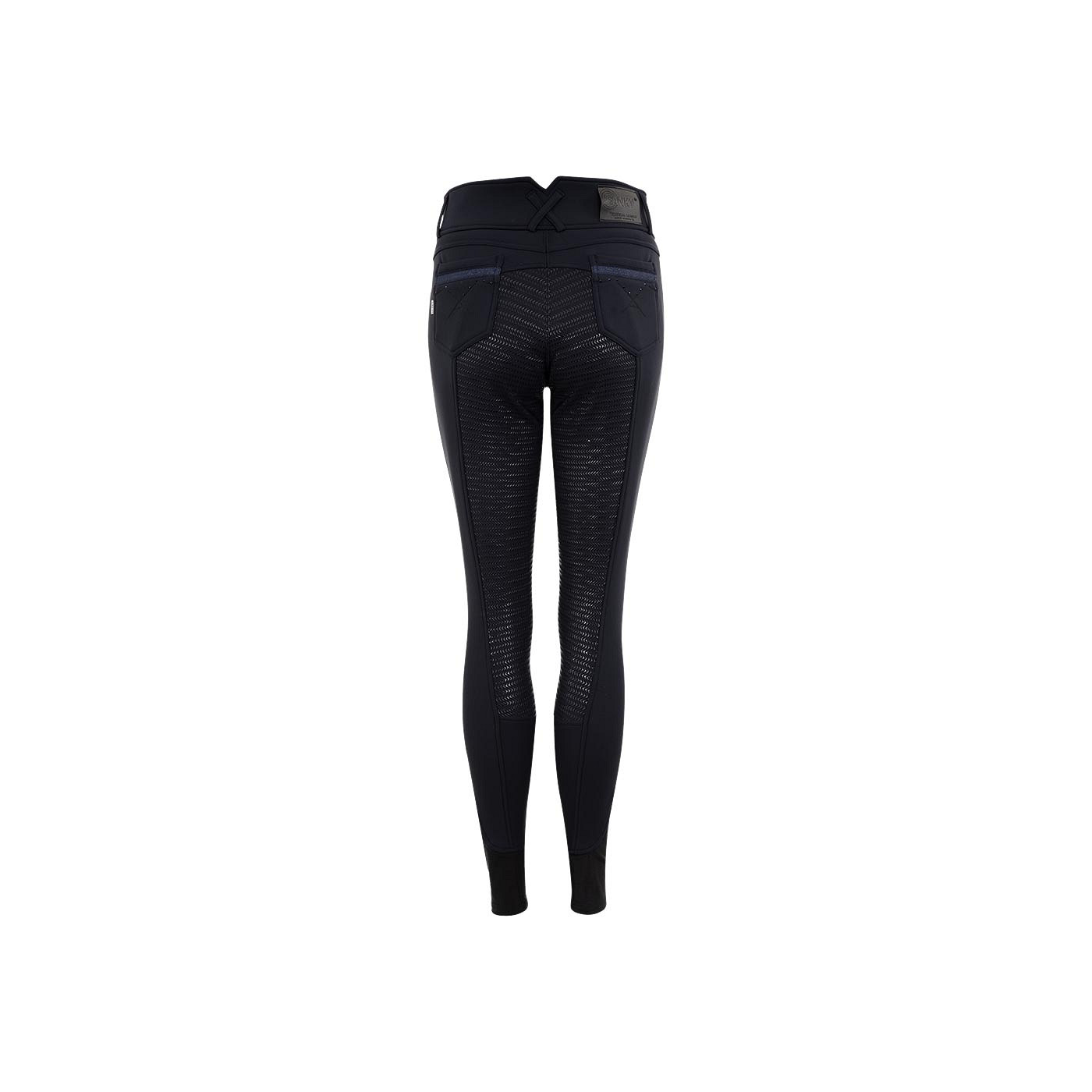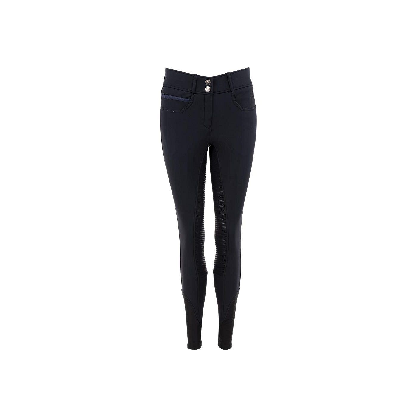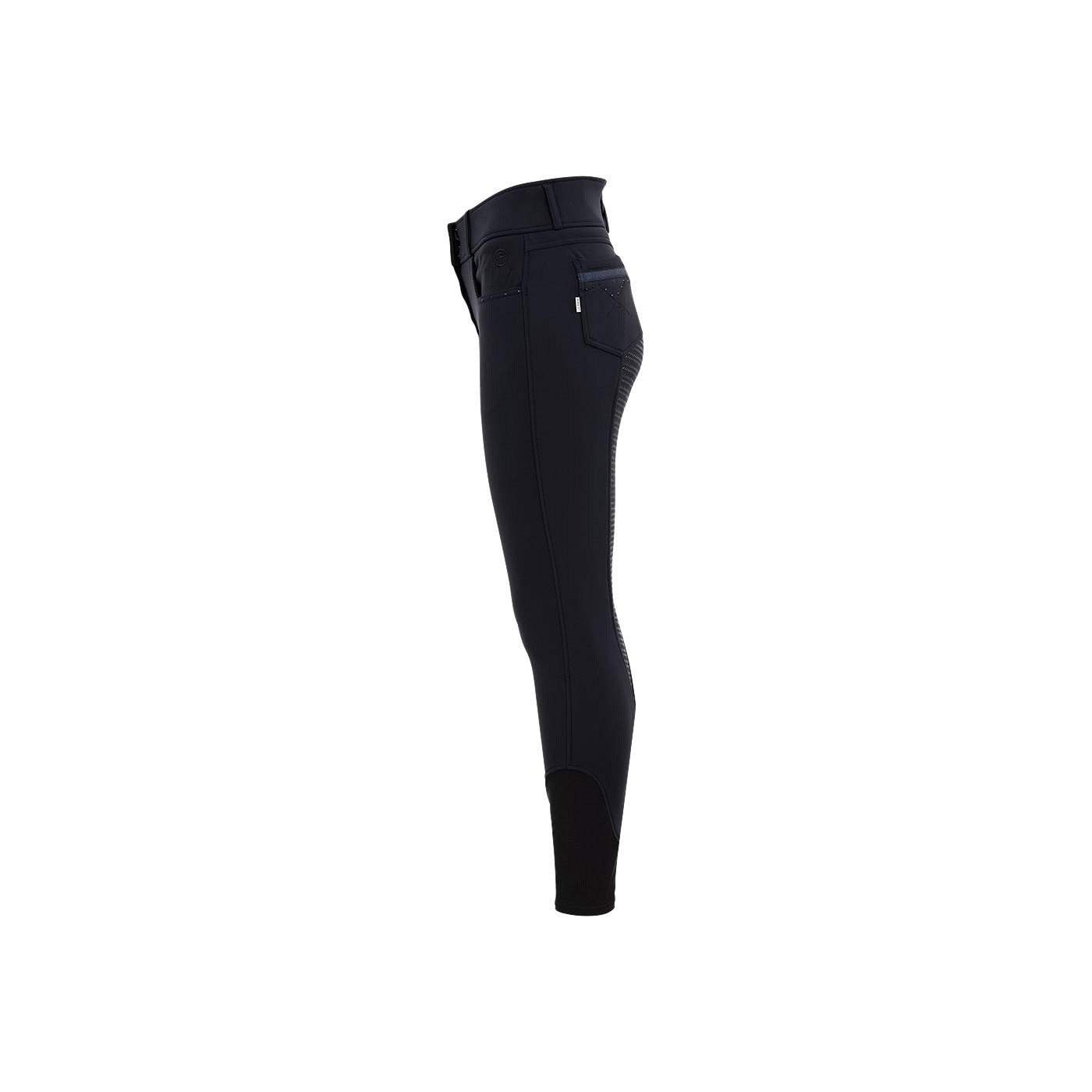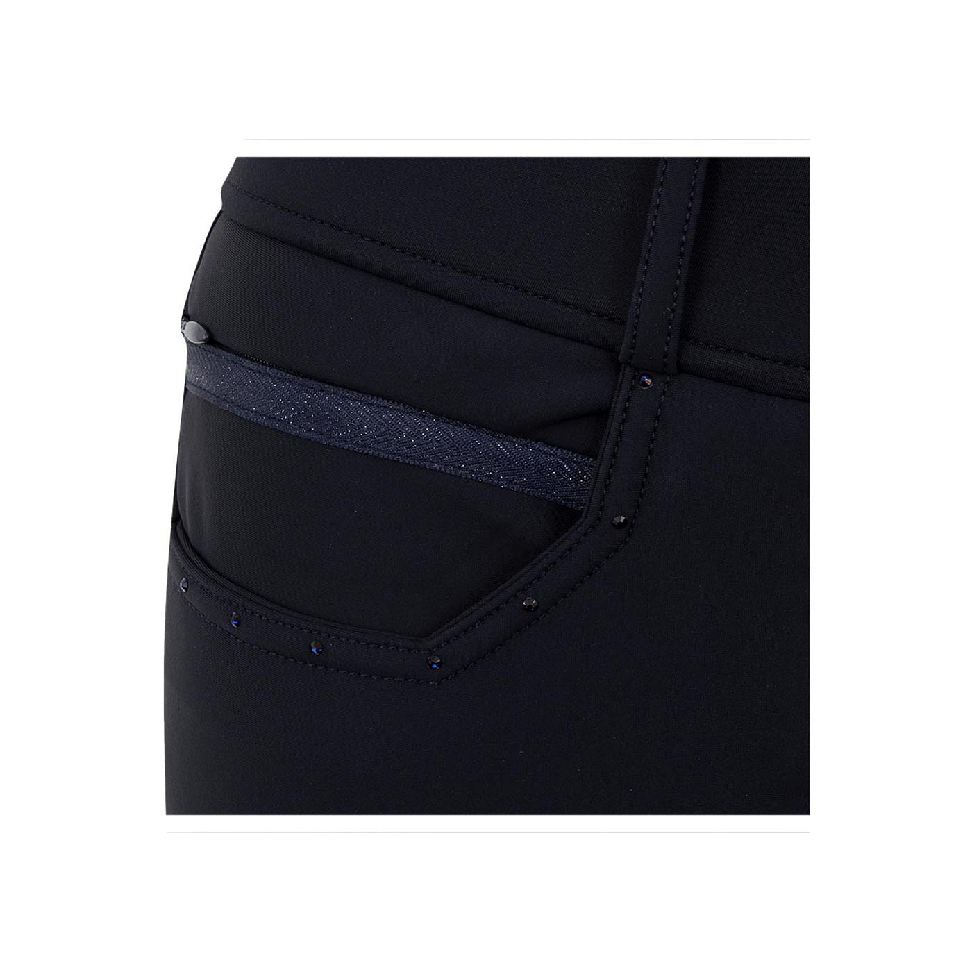 The Stone Taped riding breeches with silicone seat have a chic appearance with blue coloured rhinestones on the front and back pockets. On the right front there is a small pocket with a concealed zipper covered by a blue decorative band. Furthermore, the riding breeches have two hook and eye front closures and a silver embroidered ANKY® logo at the front.