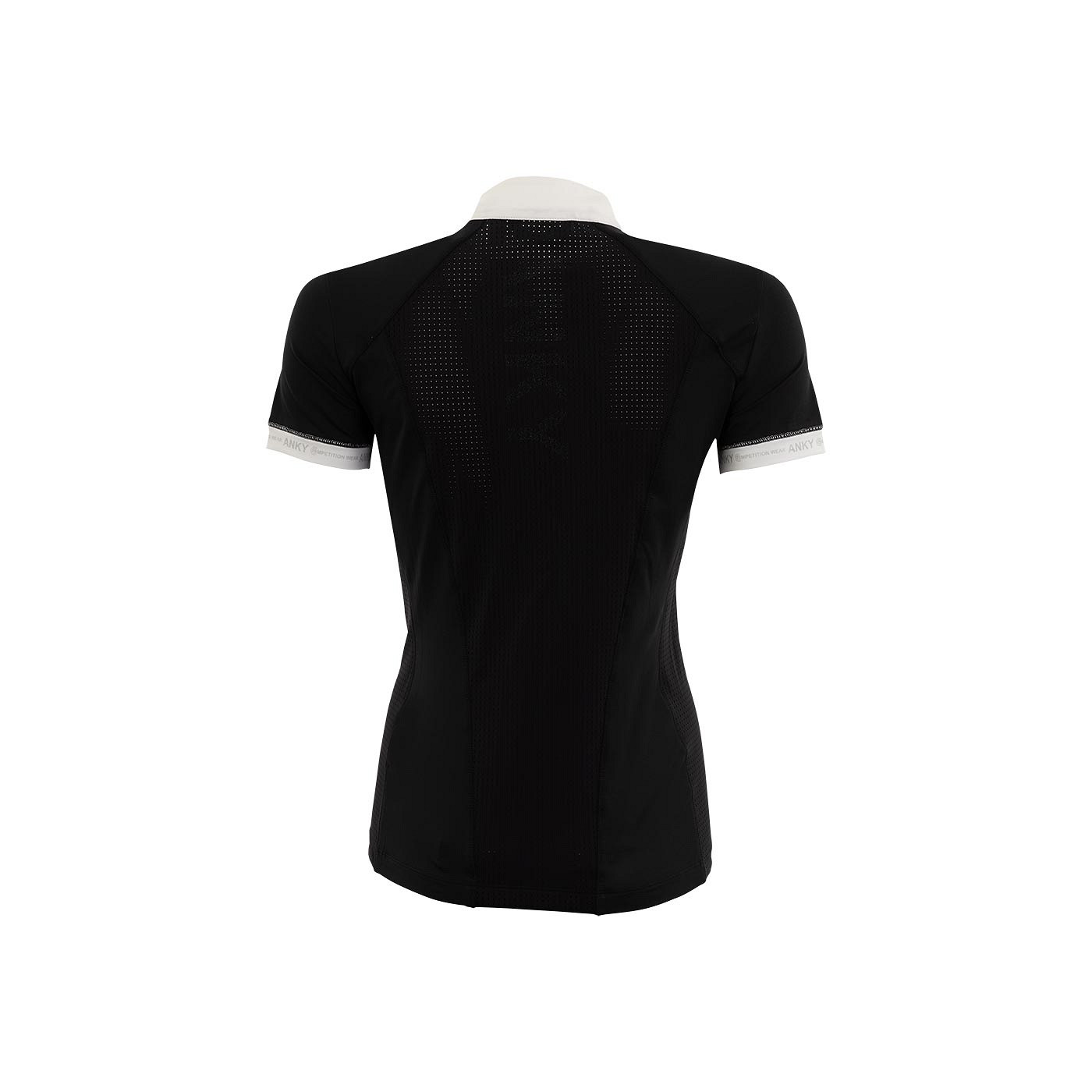 The lightweight competition shirt Textural has a nice fit thanks to the 4-way stretch material. The front zip is finished on both sides with a shiny cord piping. The silver embroidery/artwork and flatlock stitching around the sleeves give the shirt a radiant touch.