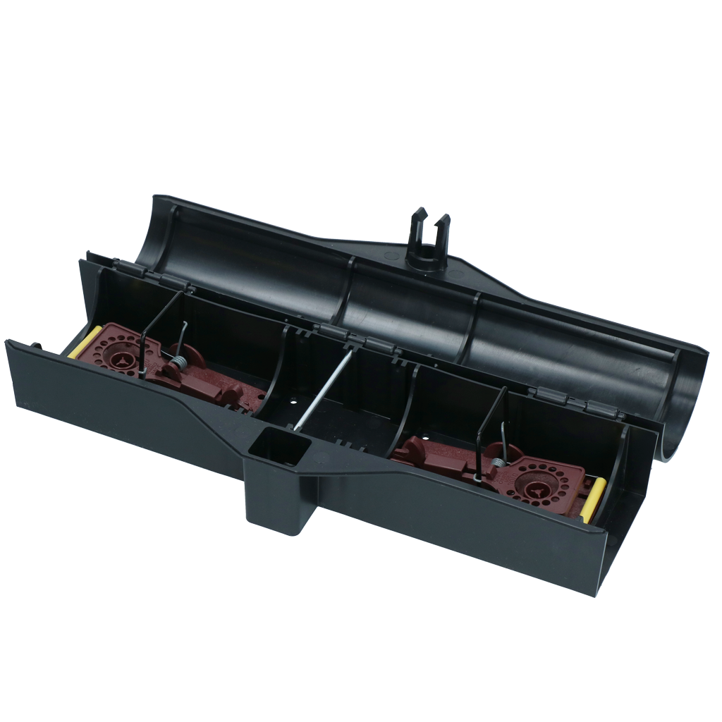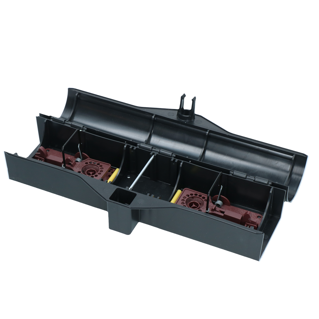 The bait box is designed to hold 2 mouse traps (e.g. the MUIS005 and MUIS008). The traps can be placed in 2 ways.