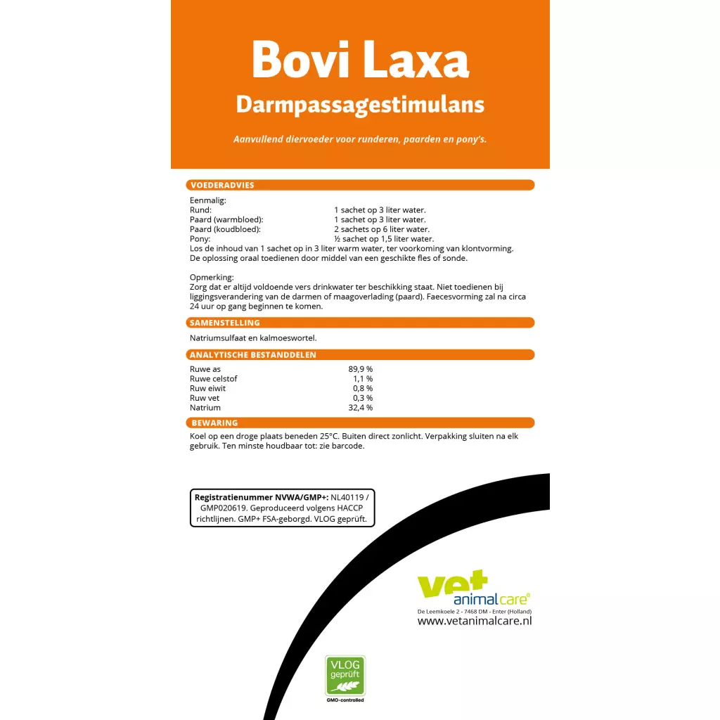 Bovi Laxi is composed of sodium sulphate, a bitter-tasting salt, and calamus root, which disguises this bitter taste. Sodium sulphate is not absorbed by the intestines, thereby increasing the osmotic value in the intestines. This causes the absorption of moisture from the intestines to be lowered and instead moisture is drawn through the intestines. Therefore, make sure the animal always has plenty of fresh drinking water available. The osmotic process increases the volume in the intestines, which is an incentive for the animal to defecate. Faeces will start to form after about 24 hours.