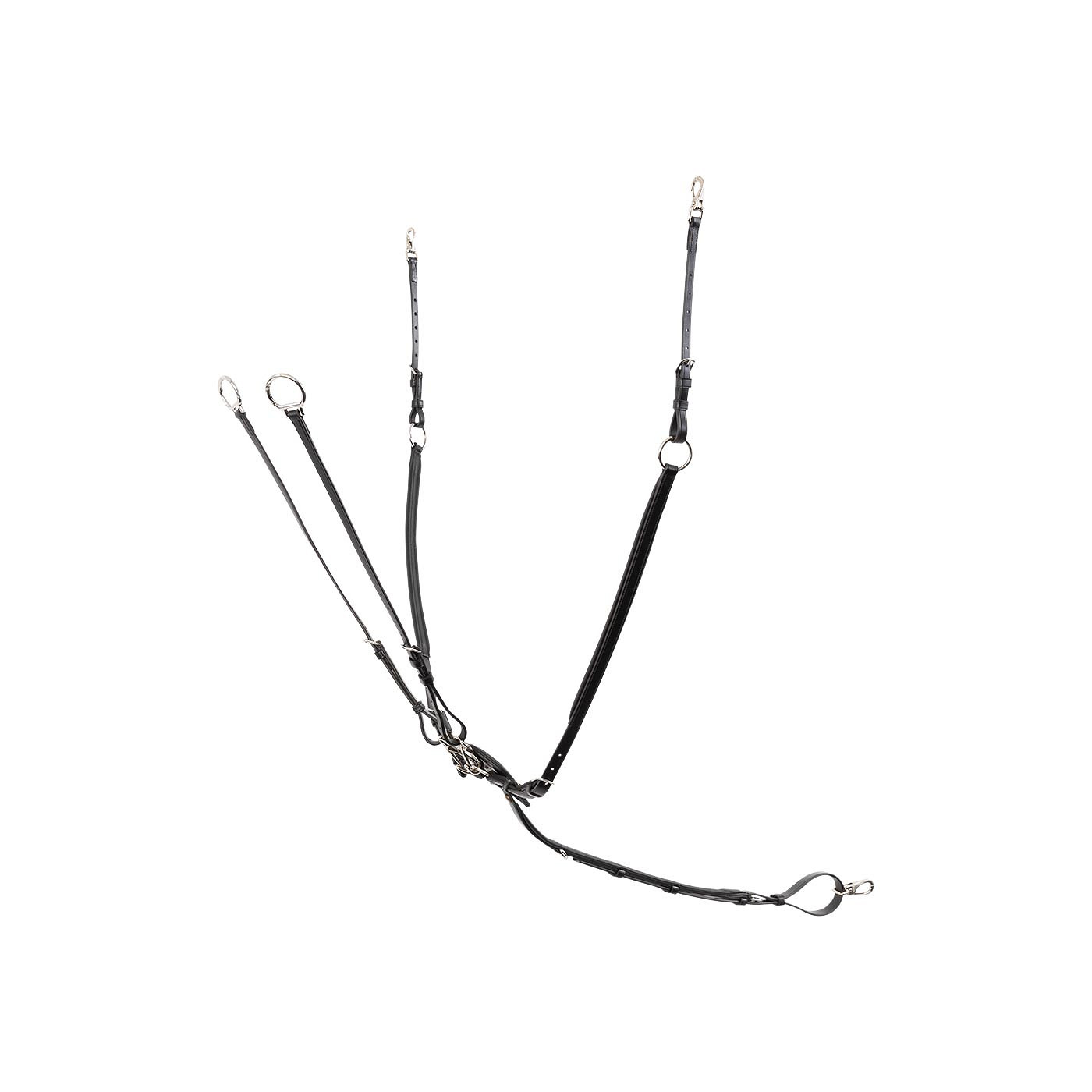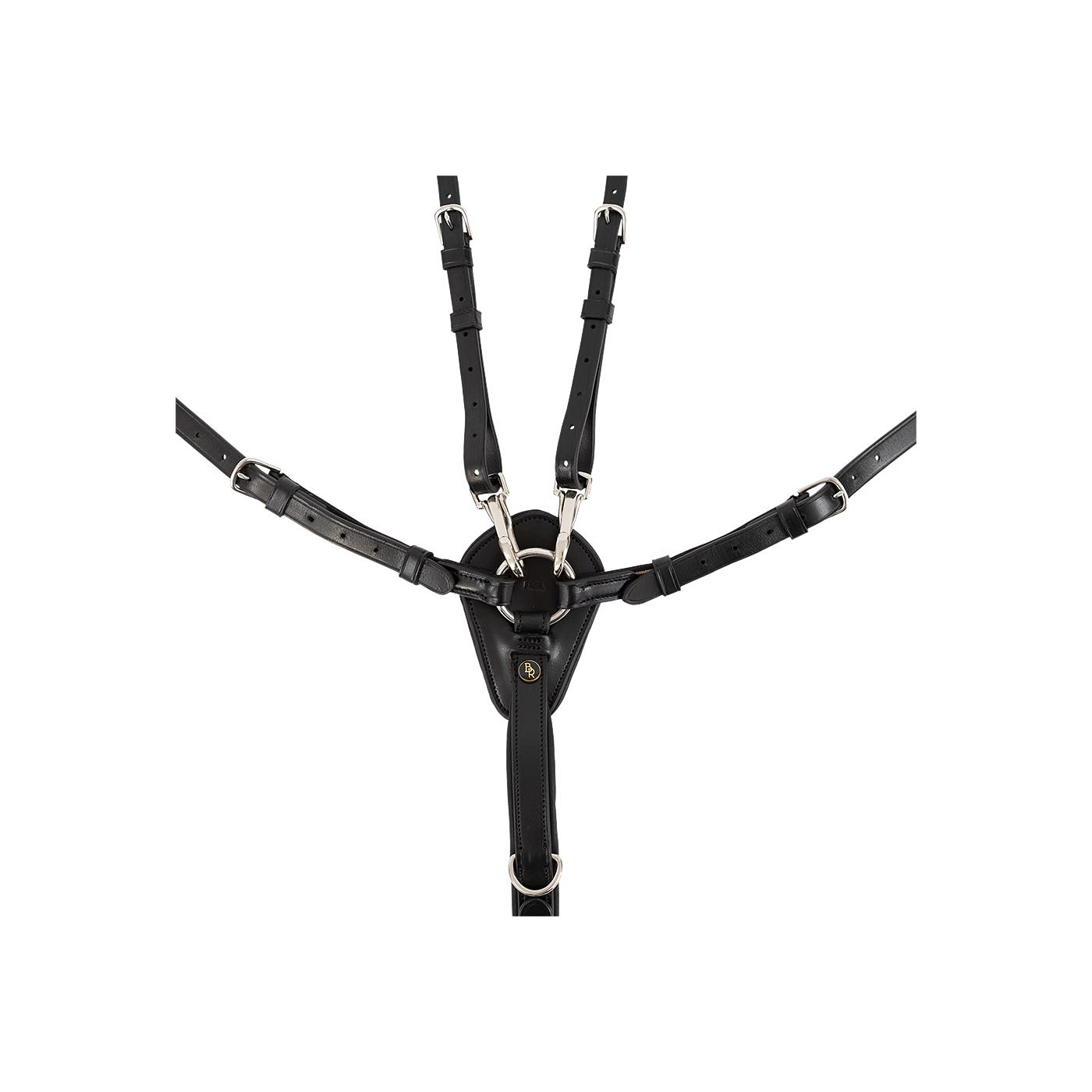 The included martingale attachment is easy to click onto the ring on the chest pad thanks to the snap hooks. The saddle attachments are equipped with elastic for an extra firm fit. Thanks to the buckles on the attachment straps and the martingale, the breastplate is adjustable in many places to ensure that it fits nicely.