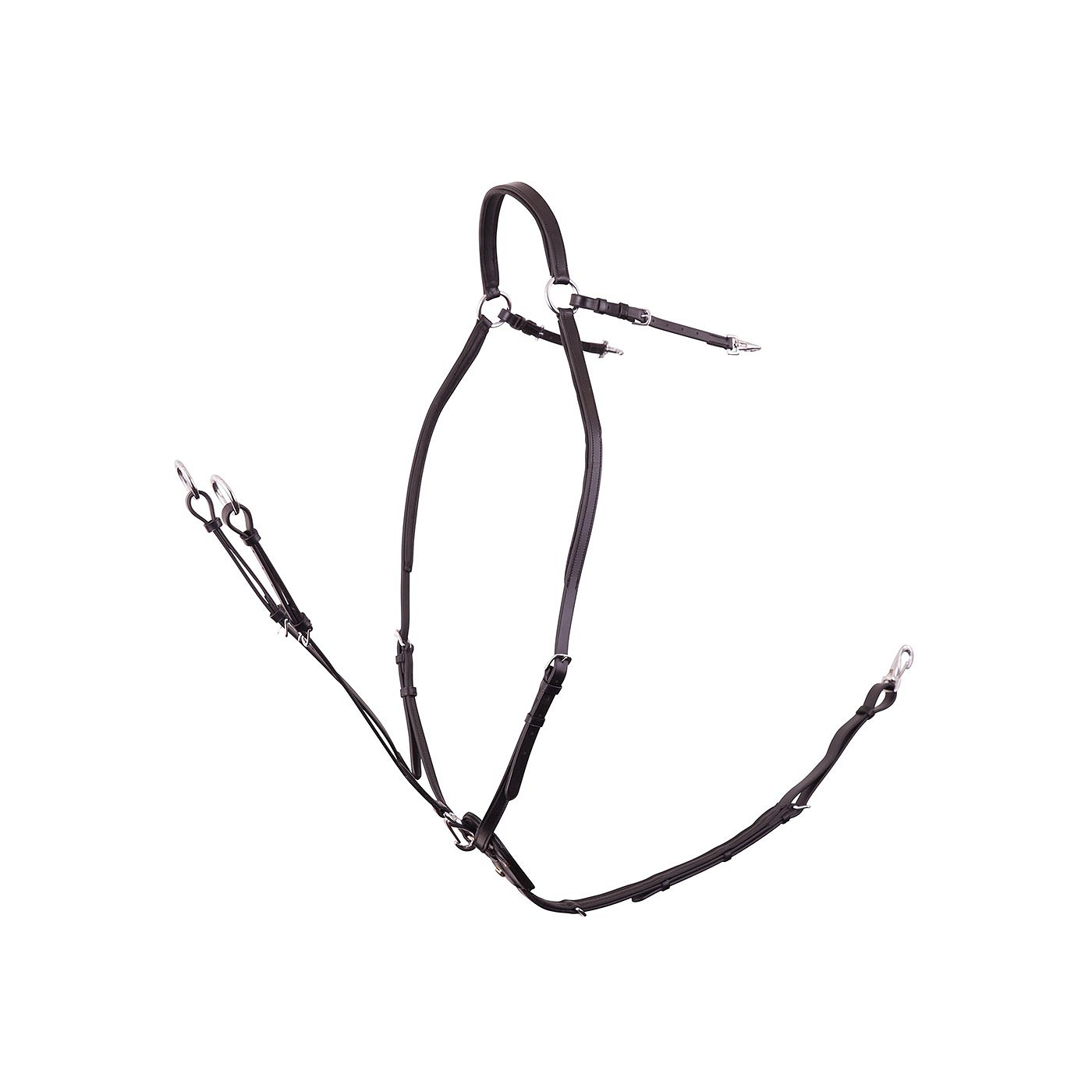 Luxurious leather breastplate with numerous settings. The breastplate can easily be attached to the saddle with the carabiners and the girth can also be attached with a carabiner or just with a buckle closure. The breast collar is made of the best full grain European leather, this leather is strong, supple, soft to the touch and is durable. Most parts have a soft lining and everything is nicely finished and has high quality stainless steel hardware. The breastplate comes with an adjustable leather martingale attachment with a carabiner so it can easily taken off or it can be put on.