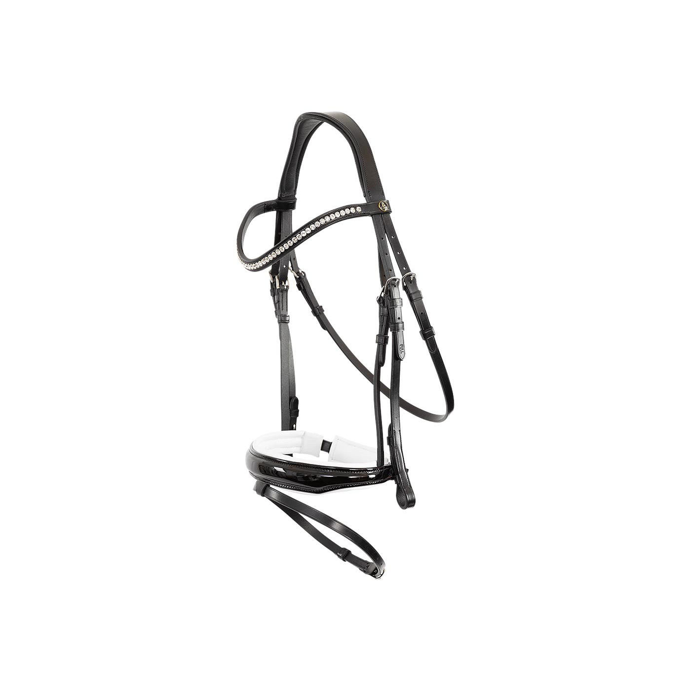 The headpiece and noseband are both softly padded for optimal comfort and anatomically shaped for a good pressure distribution and fit. The browband is inlaid with a chain of luxurious Stellux™ crystals. The Stellux™ crystals are fully clamped, making them extra secure. The anatomic crank noseband has an extra thick, pleasant padding and stands out with its luxurious patent leather look.
