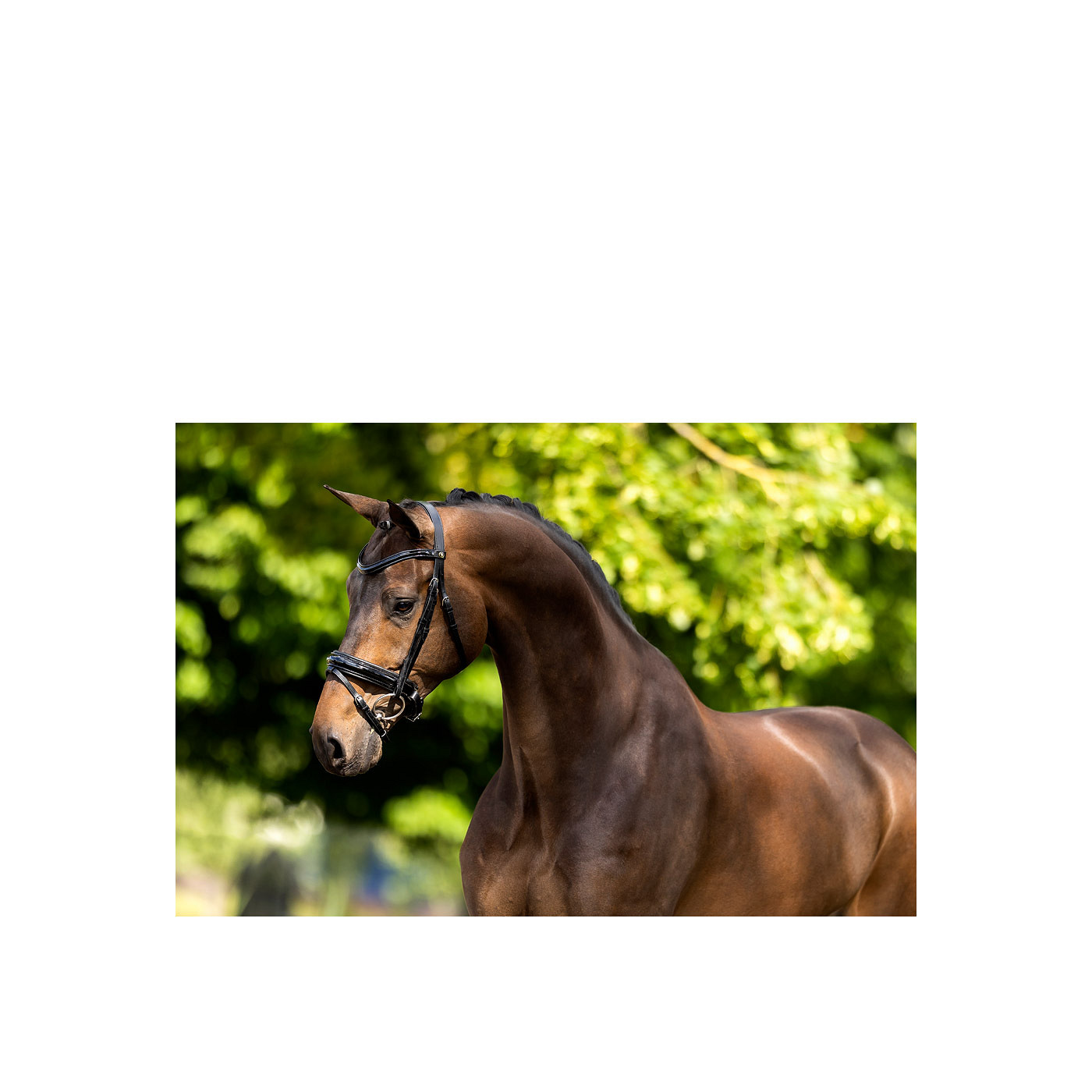 Symmetric bridle with soft padded headpiece. The curved browband is round raised and has a patent leather cover and a soft leather lining. The extra wide (± 4.5 cm) crank flash noseband with patent leather is round raised, soft lined and has a wide chin pad with soft padded lining. The bridle has a V-shaped flash attachment, hook stud billets and round, shiny silver-coloured fittings. Supplied without reins.