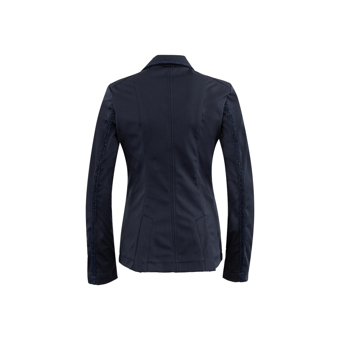 This competition jacket has various glitter elements, such as the striking buttons, the glitter piping on the collar and the glitter tape on the sleeves. The jacket also has two flap pockets.