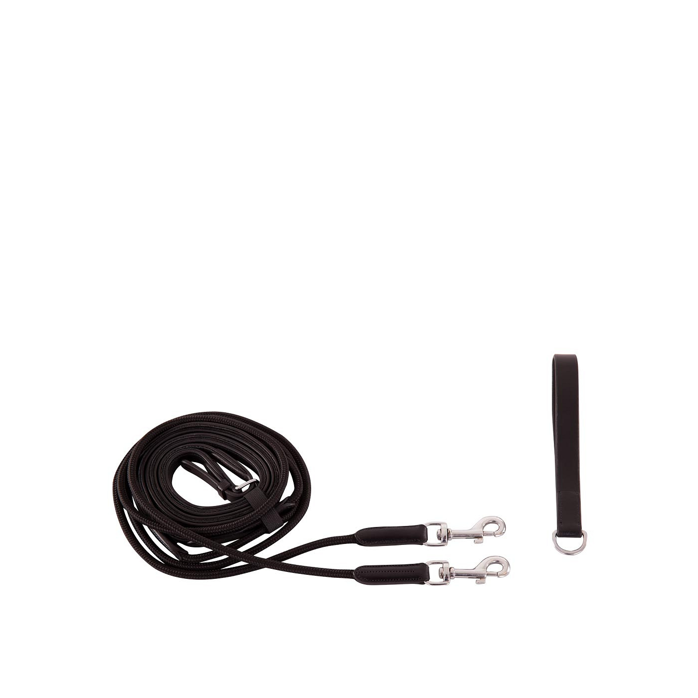 The ends of these draw reins are made of nylon cord (8 mm wide). A great advantage of cord is its smooth surface, which allows the reins to slide easily through the bit rings. The parts that are held by the rider are made of soft leather (18 mm wide). The cord ends attach to the girth by means of snap hooks. The draw reins come with a leather girth loop with D-ring, which can be used if the girth does not have a ring of its own. The girth loop has an extra protection flap for the D-ring and a leather loop keeper. The draw reins feature shiny, silver-coloured fittings made of chrome-plated brass. Draw reins allow the rider to obtain a correct position of the horse’s head. If the horse overextends its head, the draw reins will put pressure on the bit, which will subside when the horse gives way. ??Size Cob: 0.95 m webbing + 1.125 m cord = 2.075 m (4.15 m total length)?Size Full: 1.3 m webbing + 1.2 m cord = 2.5 m (5 m total length)
