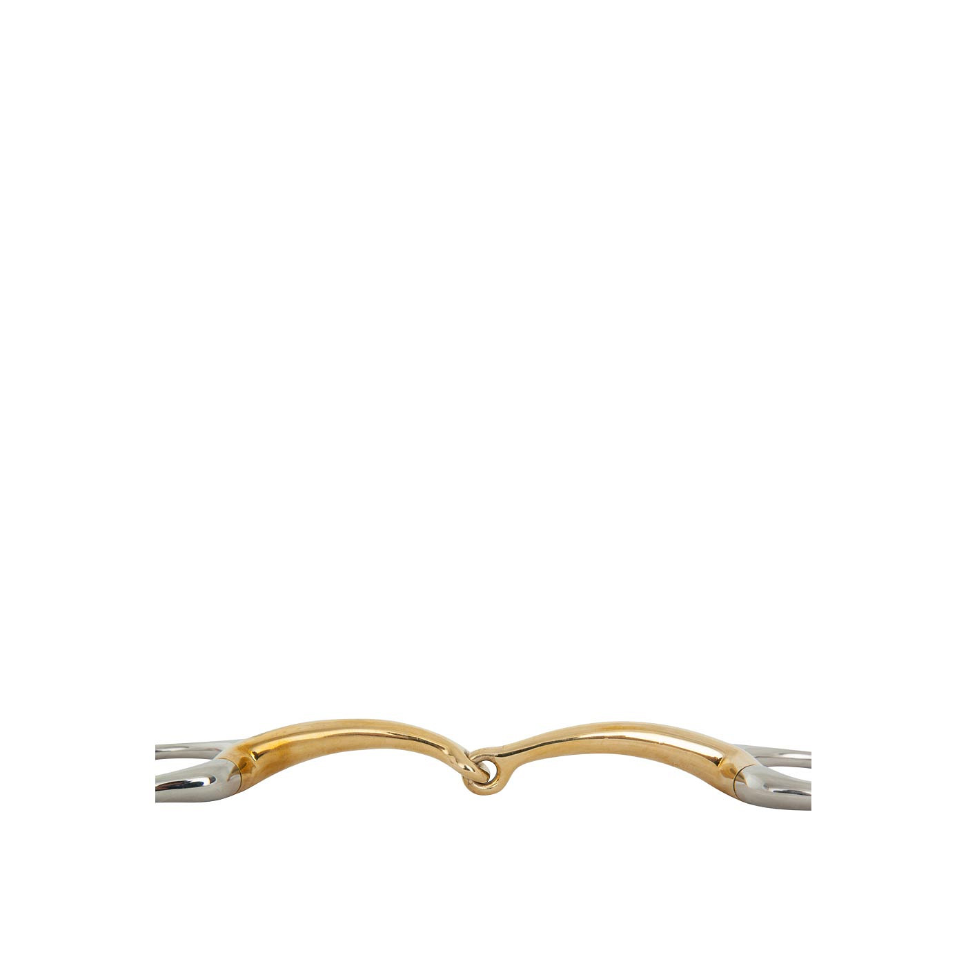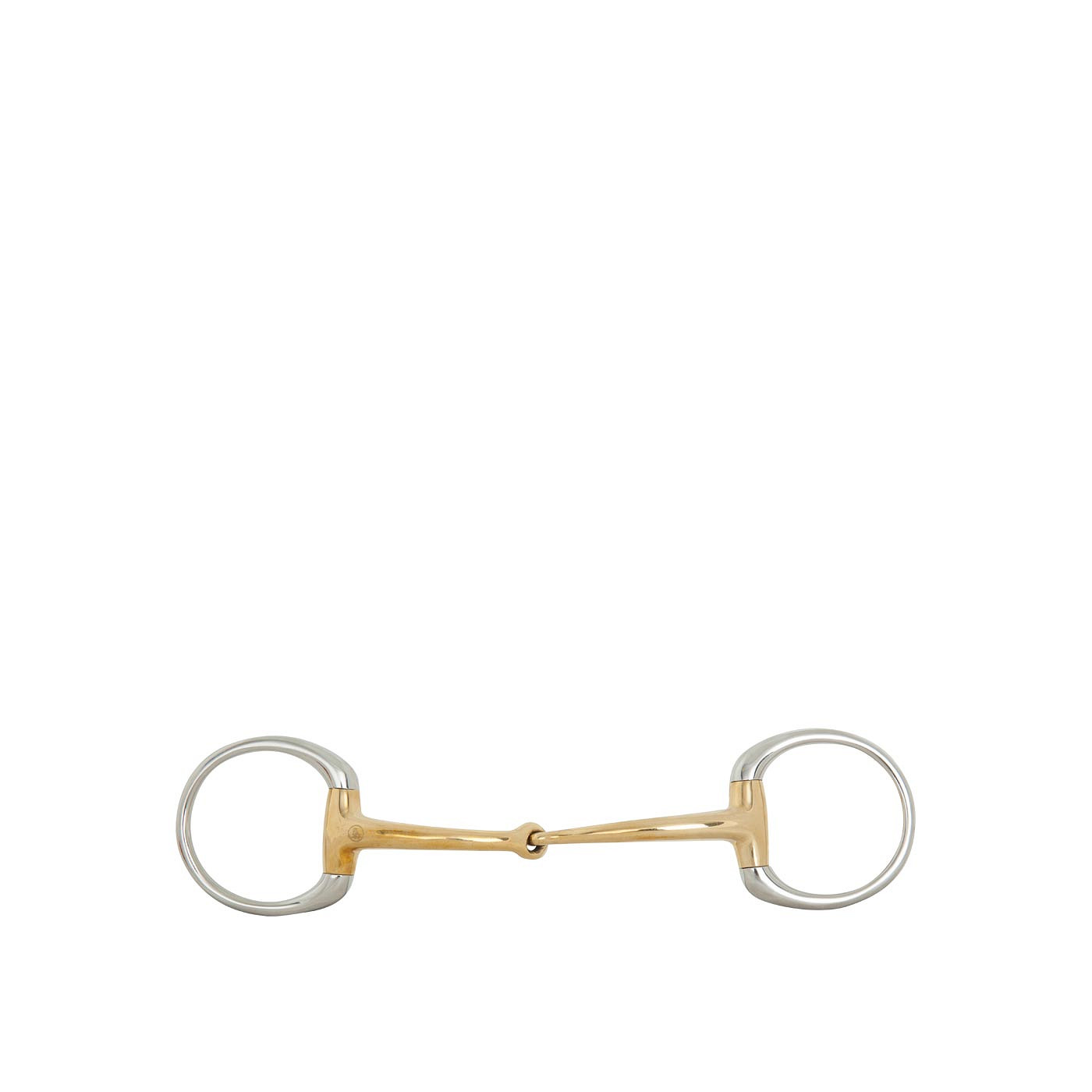 This high-quality single jointed eggbutt bradoon is made of solid Cuprigan with stainless steel rings. Cuprigan is an alloy consisting of 89% copper, 7% aluminium, 3% iron and 1% zinc. The oxidation process of the material gives a pleasant smell and taste. The anatomical design of the bit follows the shape of the horse’s mouth, which allows for a gentle and even pressure distribution. The design, combined with the unique properties of Cuprigan, encourages the chewing process and saliva production, which allows for a pleasant connection with the sensitive horse’s mouth. The bit applies normal pressure on the mouth. Mouthpiece thickness 12 mm, ring size 50 mm.??