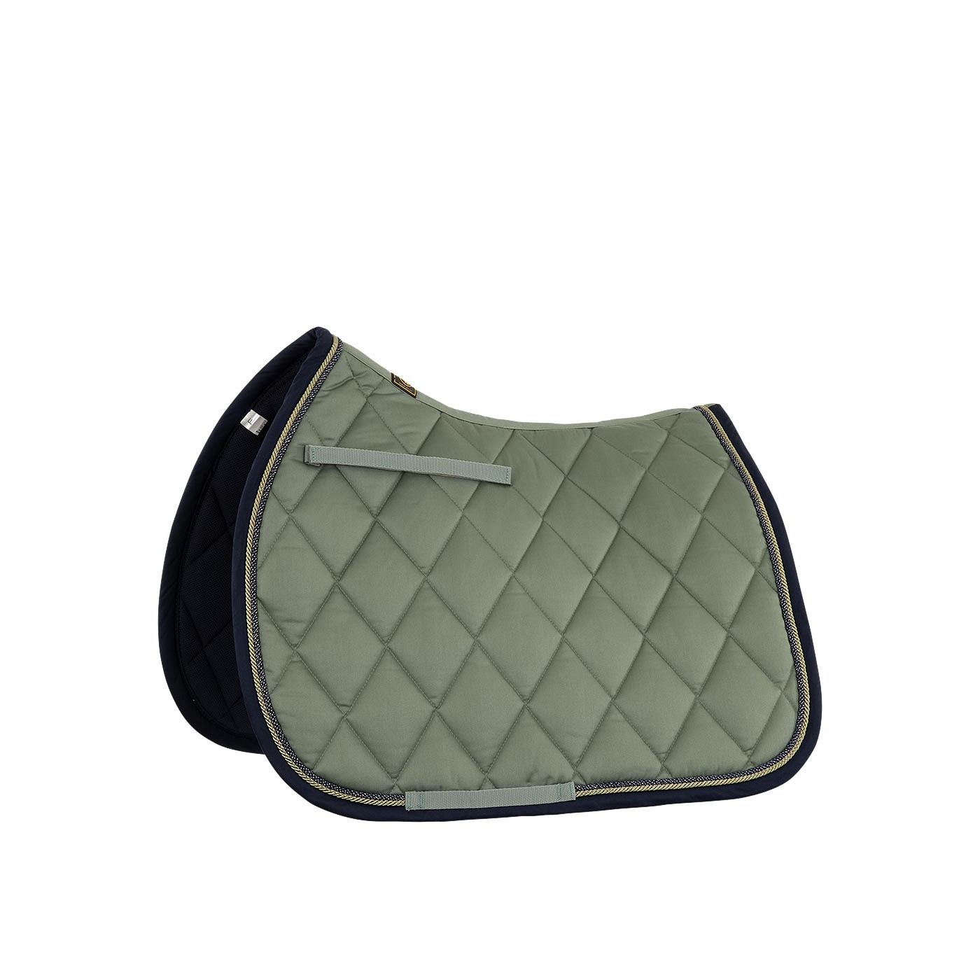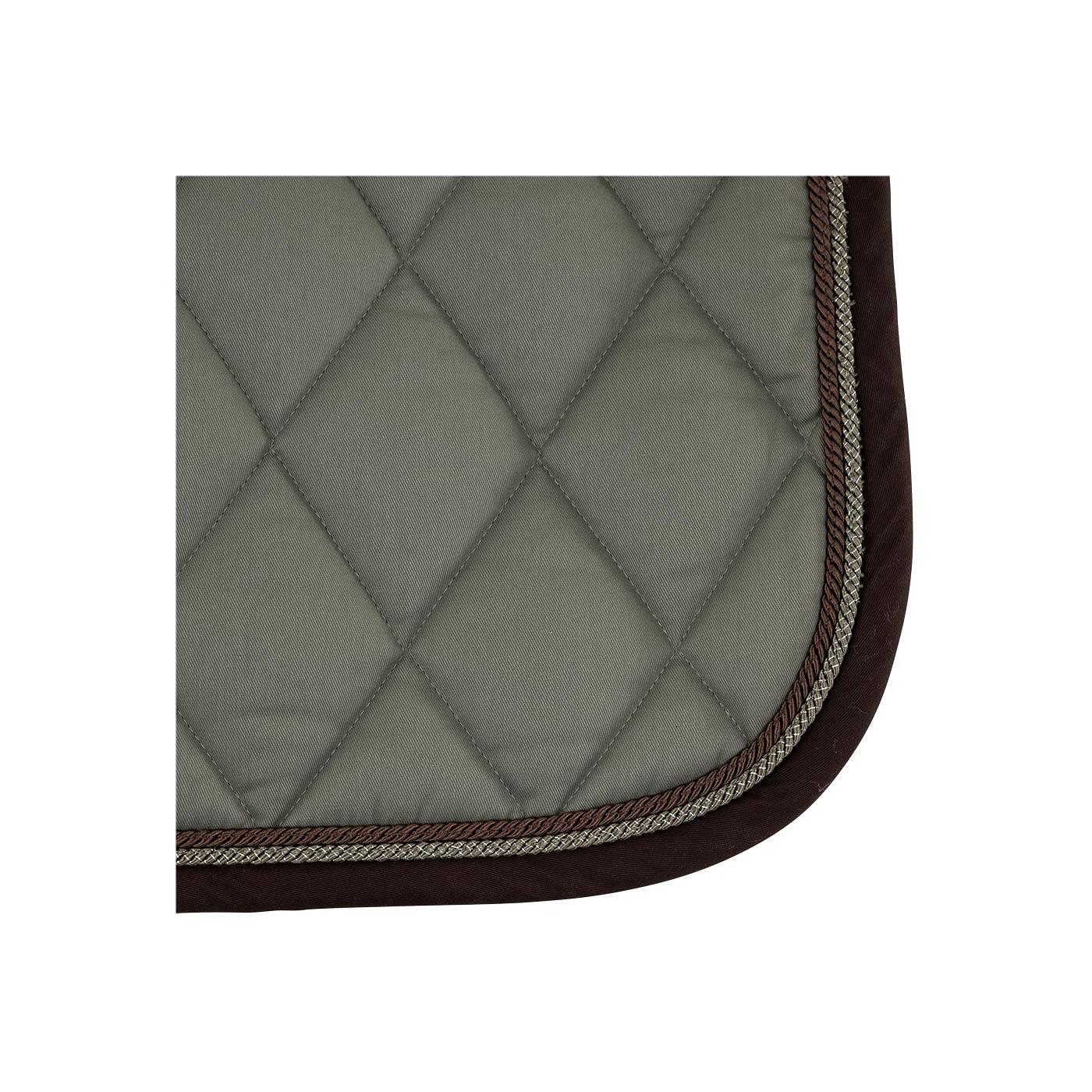 The saddle pad is decorated with one or two cord pipings and includes an adjustable retaining strap with a Velcro closure.