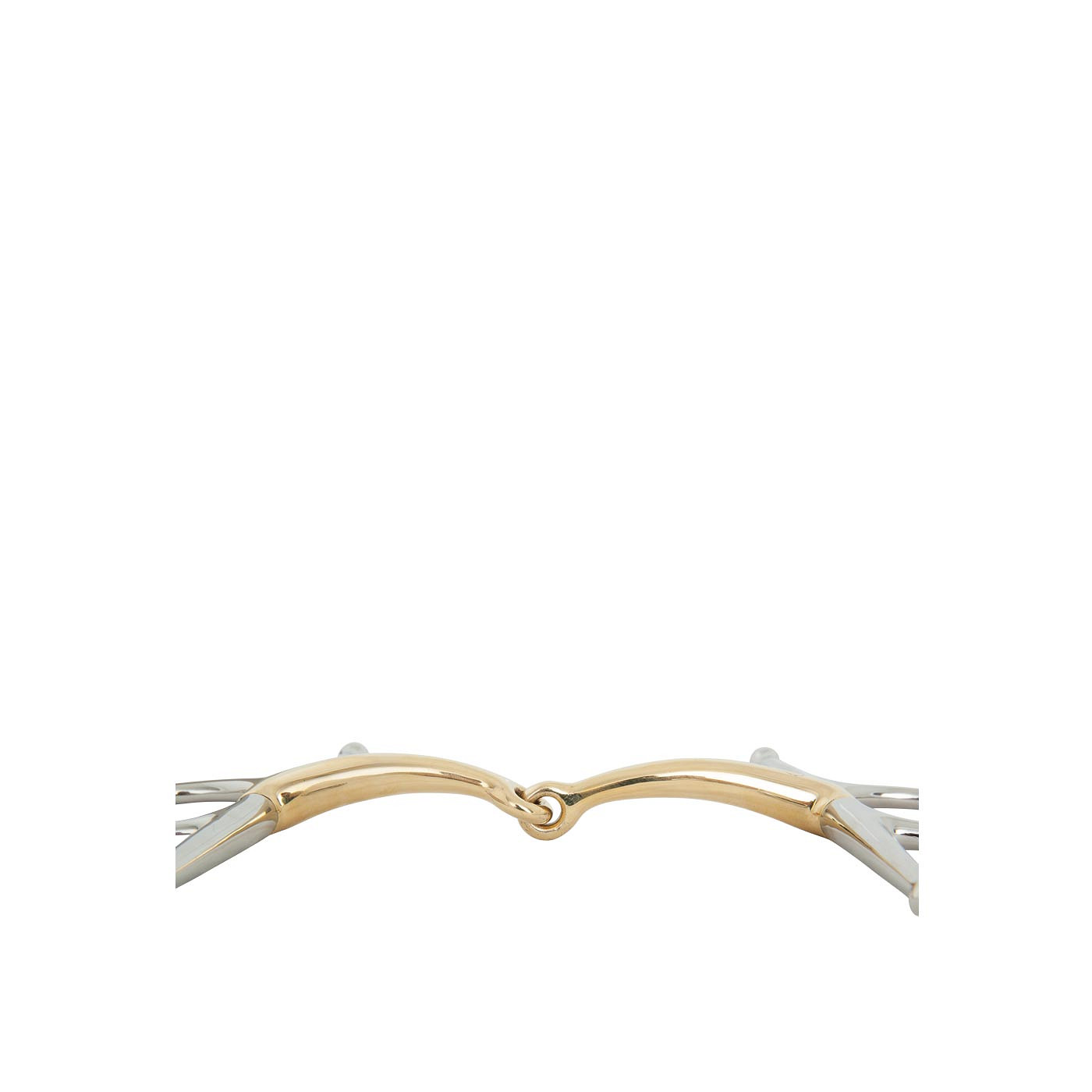 This high-quality single jointed full cheek, featuring swivel cheeks, is made of solid Cuprigan with stainless steel rings and cheeks. Cuprigan is an alloy consisting of 89% copper, 7% aluminium, 3% iron and 1% zinc. The oxidation process of the material gives a pleasant smell and taste. The anatomical design of the bit follows the shape of the horse’s mouth, which allows for a gentle and even pressure distribution. The design, combined with the unique properties of Cuprigan, encourages the chewing process and saliva production, which allows for a pleasant connection with the sensitive horse’s mouth. The bit applies normal pressure on the mouth. Mouthpiece thickness 14 mm, shank length 165 mm.?