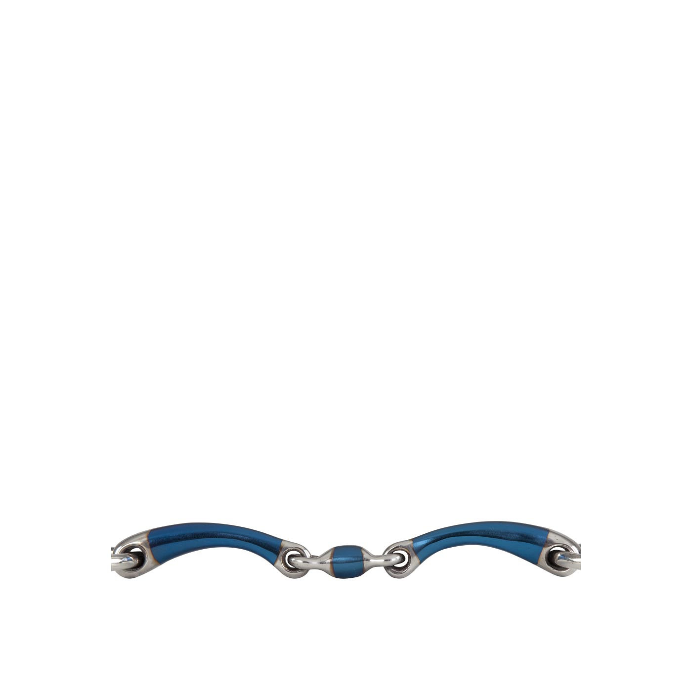 This double jointed loose ring snaffle is made of solid stainless steel rings and a mouthpiece of mild steel combined with a layer of sweet iron on the mouthpiece (blue). The sweet iron stimulates the chewing process and saliva formation. When this material reacts with moisture, warmth and air in a process called oxidation, the surface rust tastes sweet. As a result, the horse will be more willing to accept the bit. The blue colour disappears eventually, but the taste of the surface rust remains.
