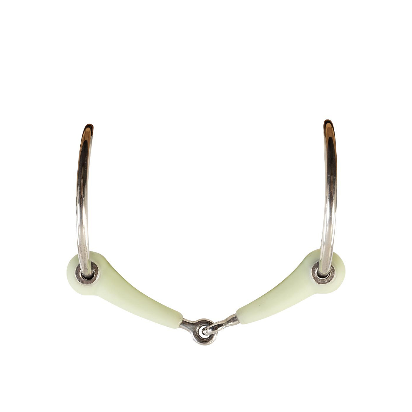 This single jointed loose ring snaffle has a synthetic mouthpiece with a metal core and stainless steel rings. Thanks to the combination of flexible plastic and high-quality stainless steel, the bits are stable, yet particularly soft and friendly. The plastic has a hardness of 90a and is FDA approved. This means that the material is free of solvents, contains no plasticisers and is also non-toxic. The anatomical design follows the shape of the horse’s mouth, creating a gentle and even pressure distribution. A loose ring snaffle allows the mouthpiece to move freely relative to the rings. This type of bit allows a lot of movement, making it one of the most easily accepted bits.
