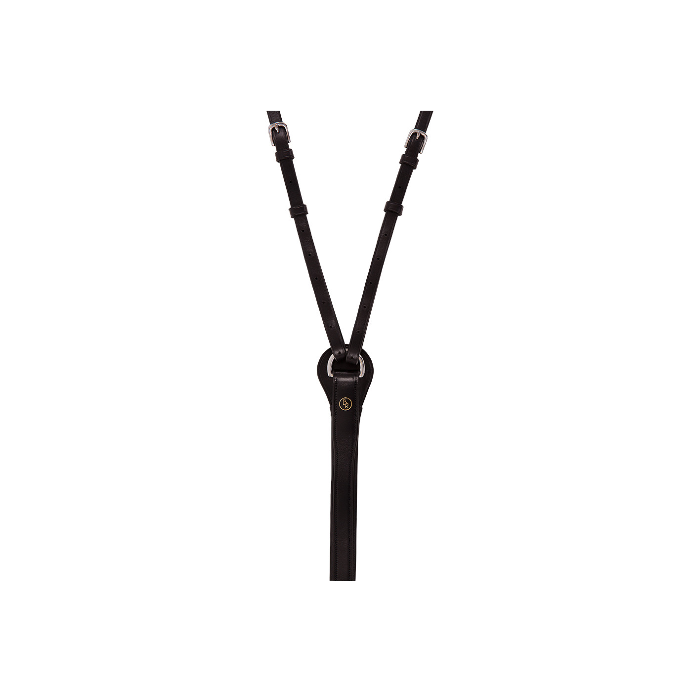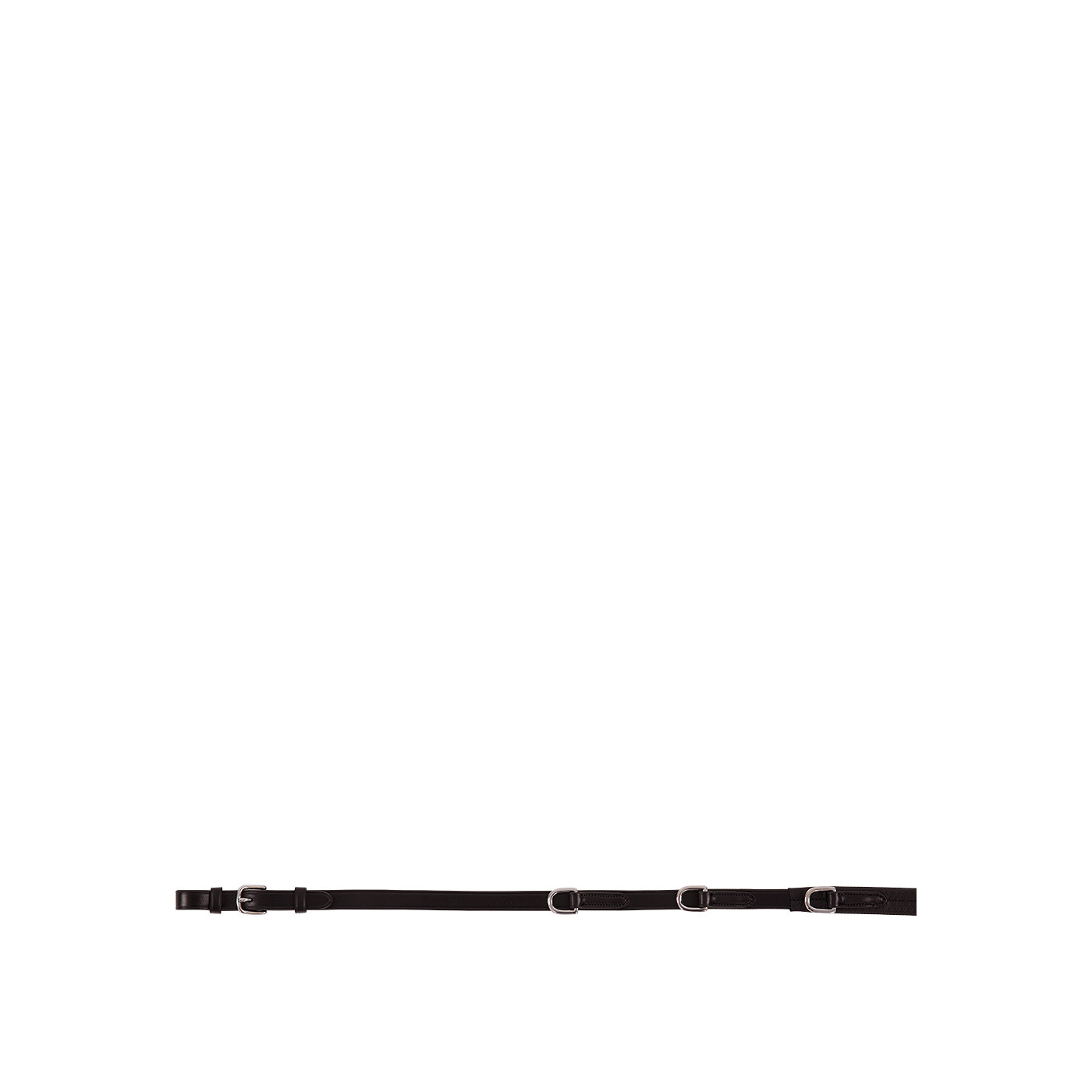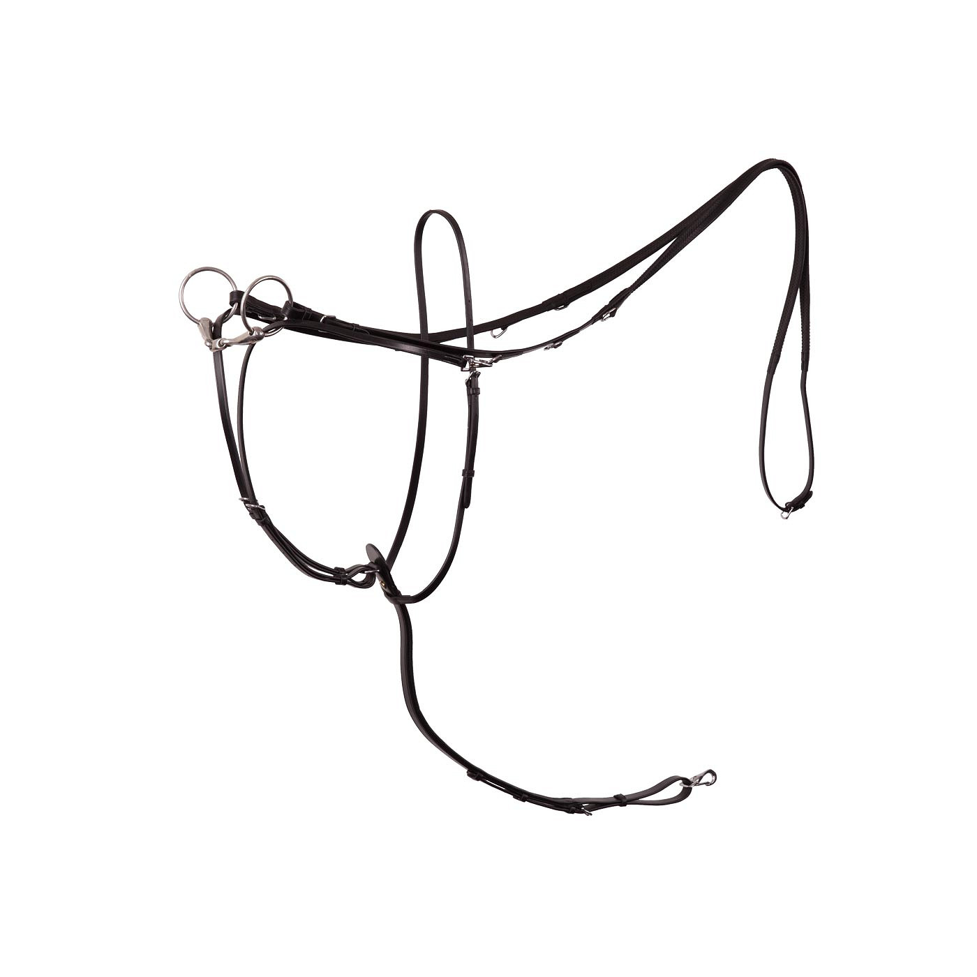 Leather Market Harborough (also known as German martingale or Thiedemann reins) with an adjustable neck strap. Attaches to the girth by means of an adjustable girth loop with detachable carabiner. The narrow straps of the running martingale are adjustable as well and fitted with snap hooks. The rubber rein (21 mm wide) has leather ends (15 mm wide) with buckles. The rein has three D-rings stitched on both sides: two on the leather ends and one on the rubber part. The narrow martingale straps are passed through the bit rings and attached to the D-rings of the rein by means of carabiners. The Market Harborough features shiny, silver-coloured fittings made of chrome-plated brass. This training aid prevents the horse from extending its head too far upwards or ahead when riding.