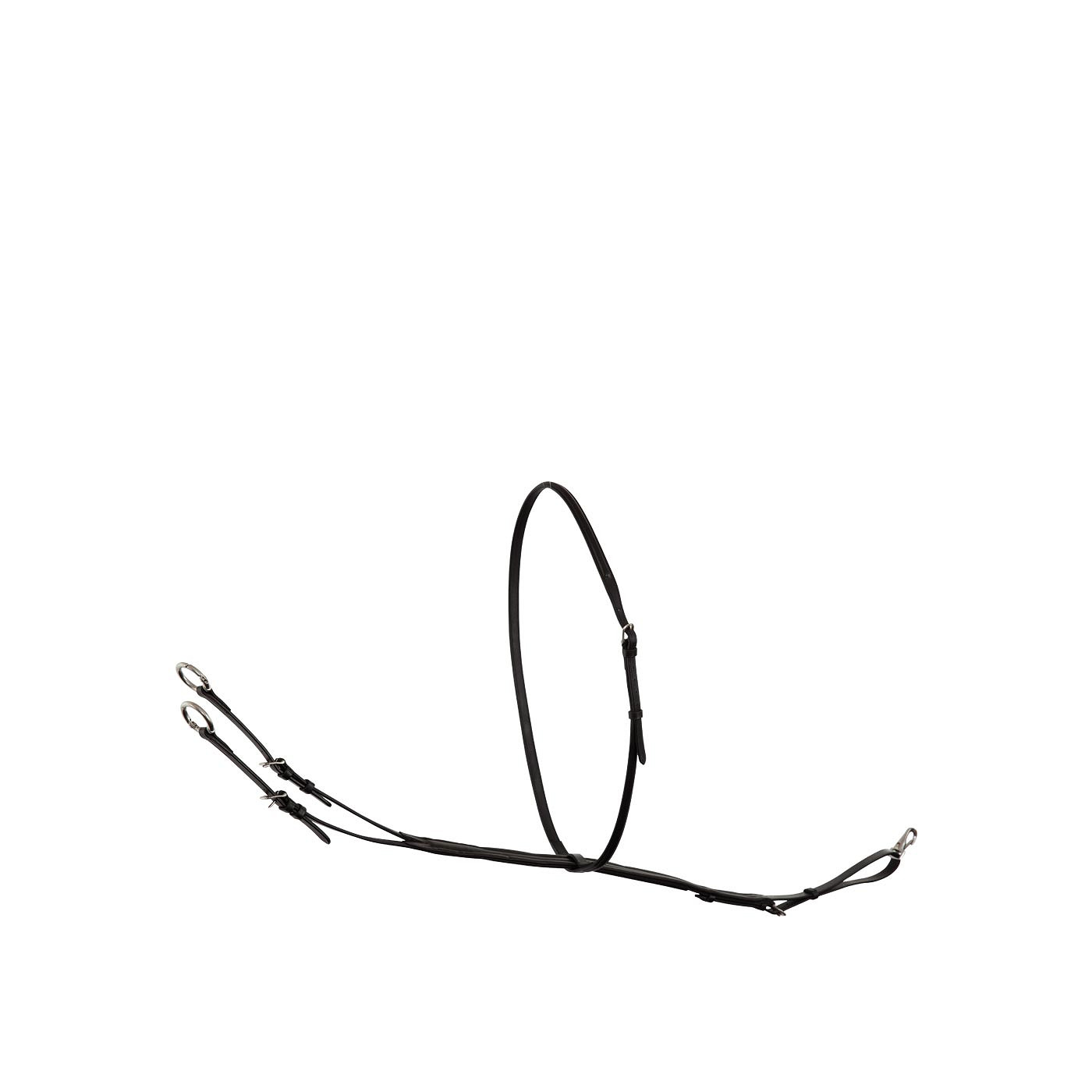 Leather martingale with silver plated brass buckles. The martingale, mostly used in jumping, prevents the horse from throwing its head. The martingale adds leverage through the reins to the bit on the bars of the horse’s mouth, not on the less sensitive mouth corners. The martingale is padded for added comfort and the rein rings feature special clips. The special round clips open inwards making it very easy to attach the reins while preventing the reins from coming loose during riding. Made of European leather. With rubber martingale stops.