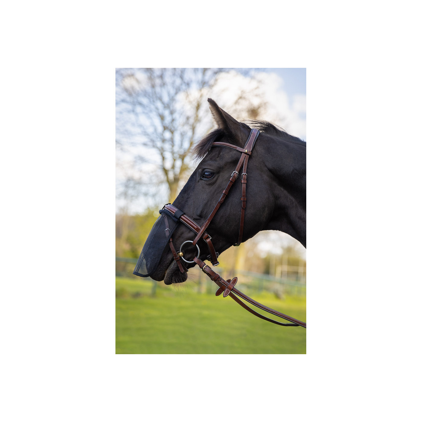 The nose made of polyester mesh net protects the horse’s nose against the smallest insects and pollen. It is breathable and does not hinder your horse’s breathing. The nose net can be attached to the noseband with the Velcro closure.