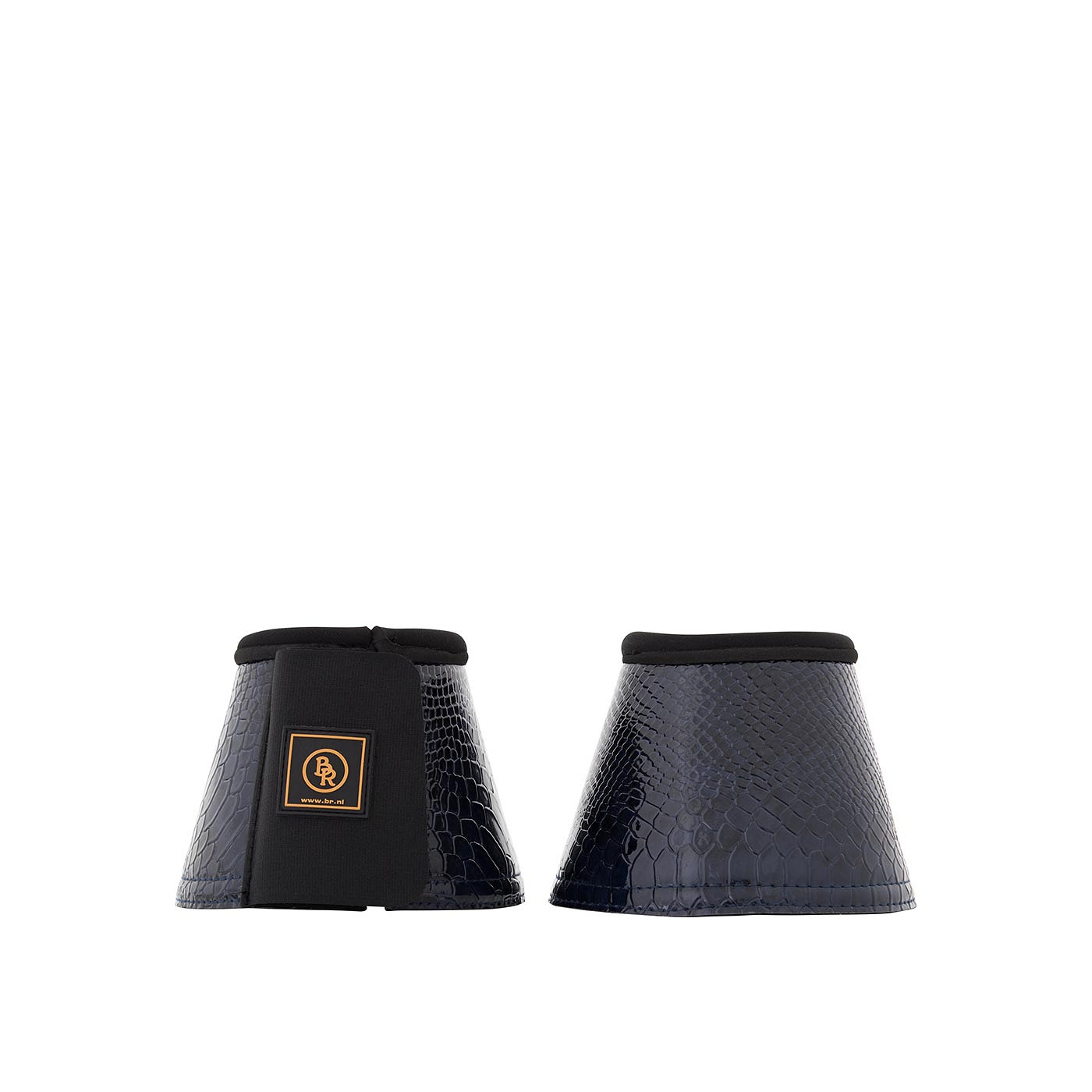 Over reach boots made of synthetic patent leather featuring a crocodile print. The over reach boots have a 5.5 cm wide neoprene lining and a wide, double Velcro closure. Over reach boots serve to prevent the horse from wounding itself by overstressing its heels or the back of the frogs.