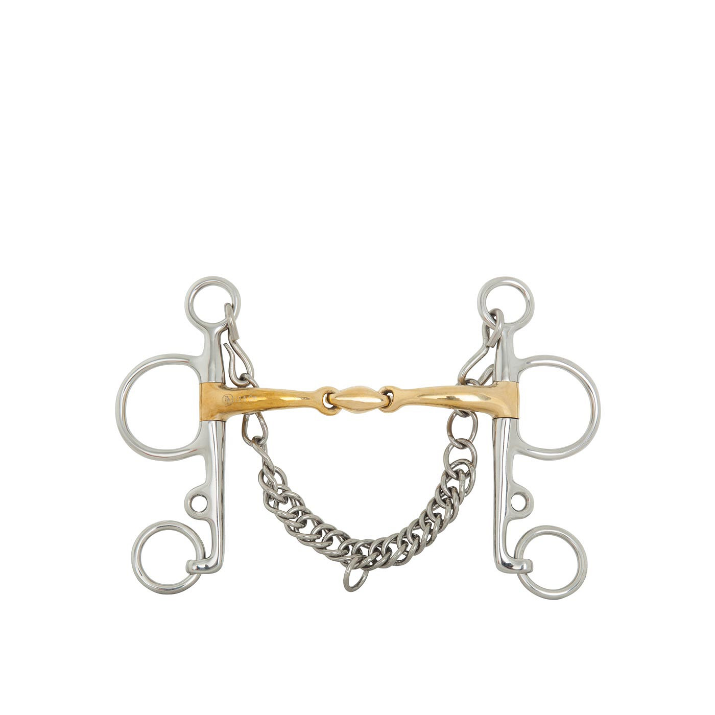 This high-quality double jointed Pelham, featuring swivel cheeks and leverage action, is made of solid Cuprigan with stainless steel rings. Cuprigan is an alloy consisting of 89% copper, 7% aluminium, 3% iron and 1% zinc. The oxidation process of the material gives a pleasant smell and taste. The anatomical design of the bit follows the shape of the horse’s mouth, which allows for a gentle and even pressure distribution. The design, combined with the unique properties of Cuprigan, encourages the chewing process and saliva production, which allows for a pleasant connection with the sensitive horse’s mouth. The upper shanks (purchase arms) with ring are turned slightly outwards, which allows for optimum freedom of the horse’s head. The bit applies sharp pressure on the mouth. Mouthpiece thickness 16 mm, shank length 145 mm. Curb chain included.?