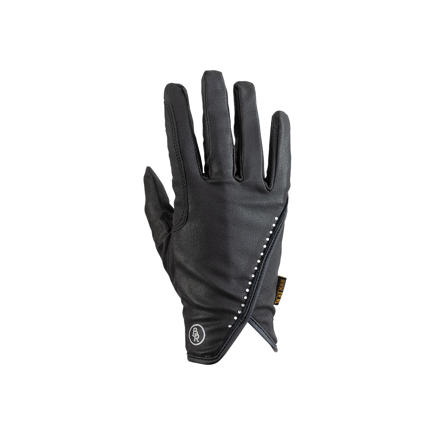 This elegant BR riding glove Glowé has a pleasant grip pattern on the palm side for a good grip on the reins. The top is luxuriously finished with a thin glitter piping and a row of small rhinestones for extra shine. The elasticated wrist ensures that the gloves remain securely in place.