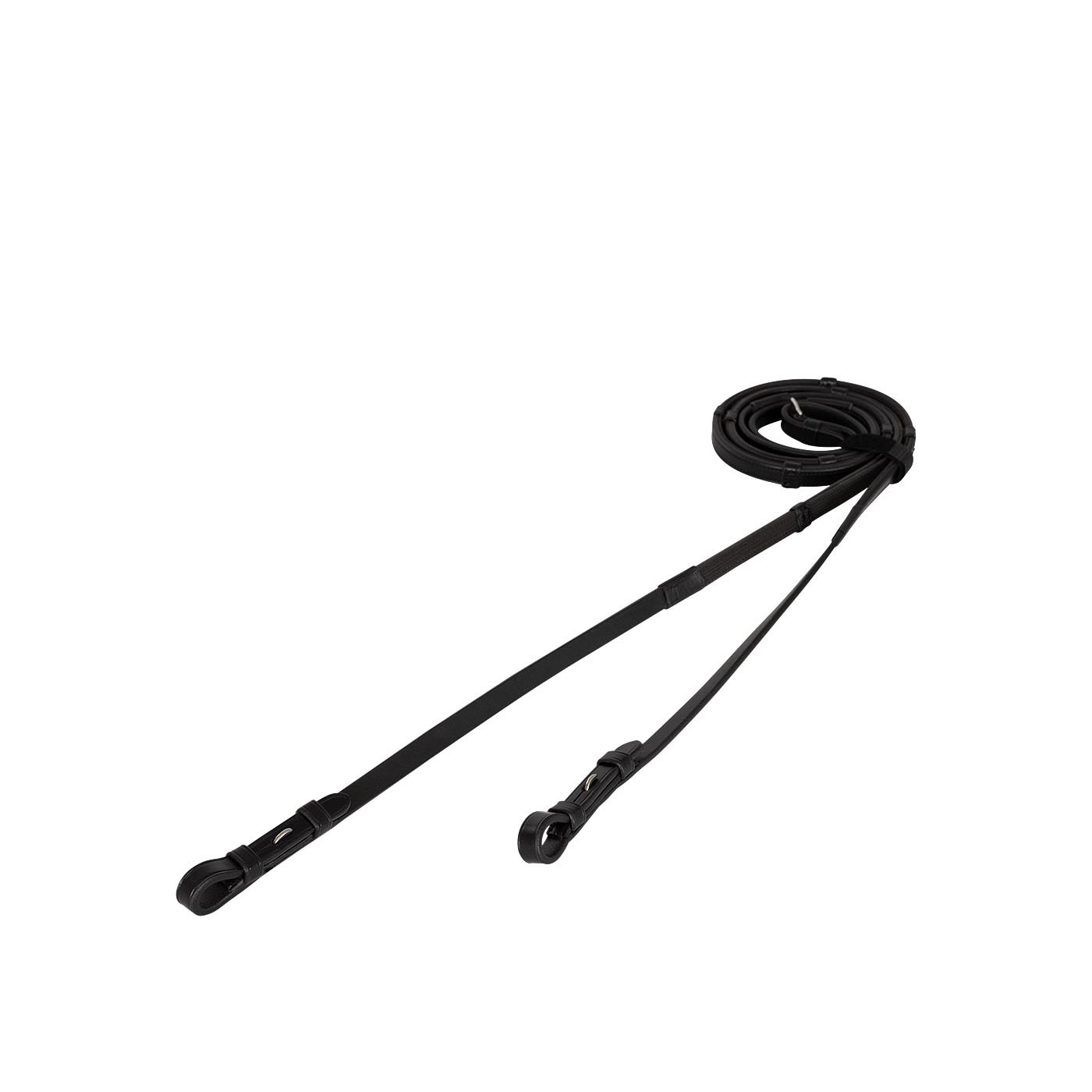 This rubber rein is combined with high-quality leather that is sturdy and stays beautiful for a long time. The inside is lined with a robust rubber anti-slip print. In addition, the rein is equipped with five leather hand stops on each side and hook stud billets at the ends. Width: 13mm (4/8”).