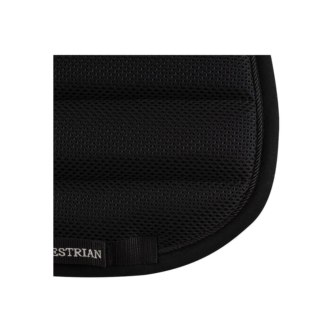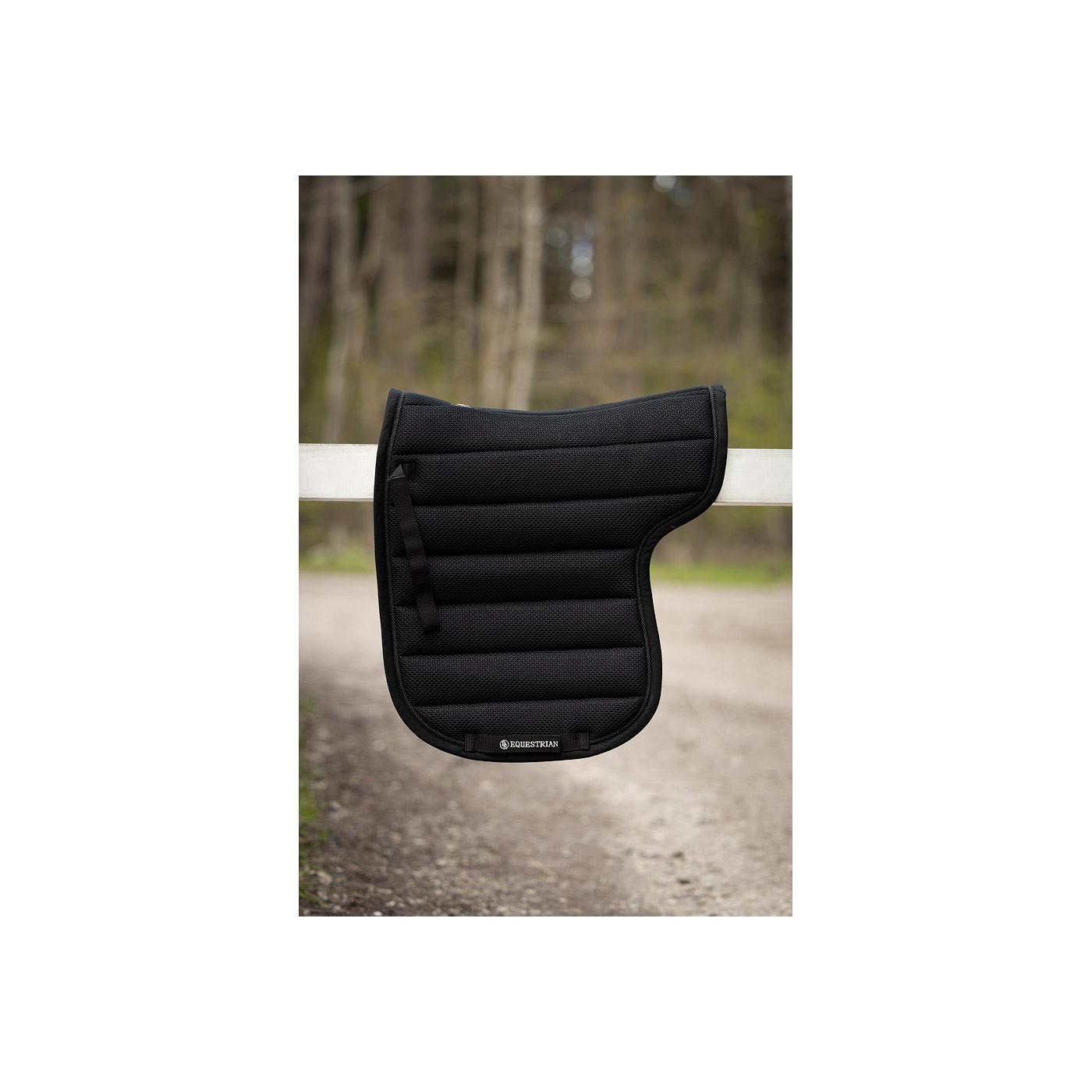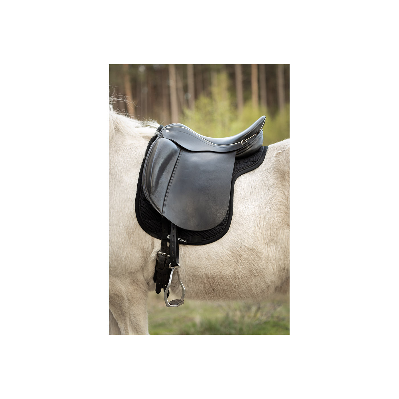 The saddle-shaped saddle pad has a soft filling of 10 mm foam and 300 g polypadding for a great shock absorption. The saddle pad is lined with a wicking, breathable, stretchy lining with a pineapple shaped pattern. In addition, the saddle pad is equipped with retaining straps and girth loops with Velcro and finished with an elegant cord trim and embroidery on the girth loop.