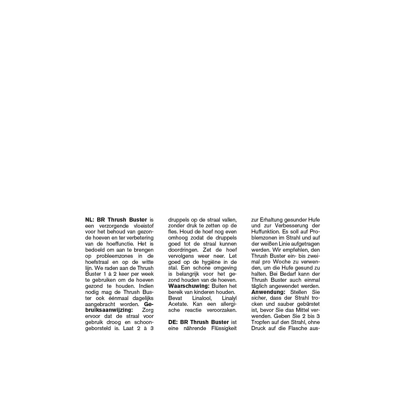 BR Thrush Buster on toitev hooldusvedelik, mis aitab säilitada kabjade tervist ja toetab nende loomulikku talitlust. Vedelik kantakse kabjakiilu ja kabjapiiri probleemsetele piirkondadele. Regulaarne kasutamine 1–2 korda nädalas aitab hoida kabjad terved, vajadusel võib toodet kasutada ka igapäevaselt.