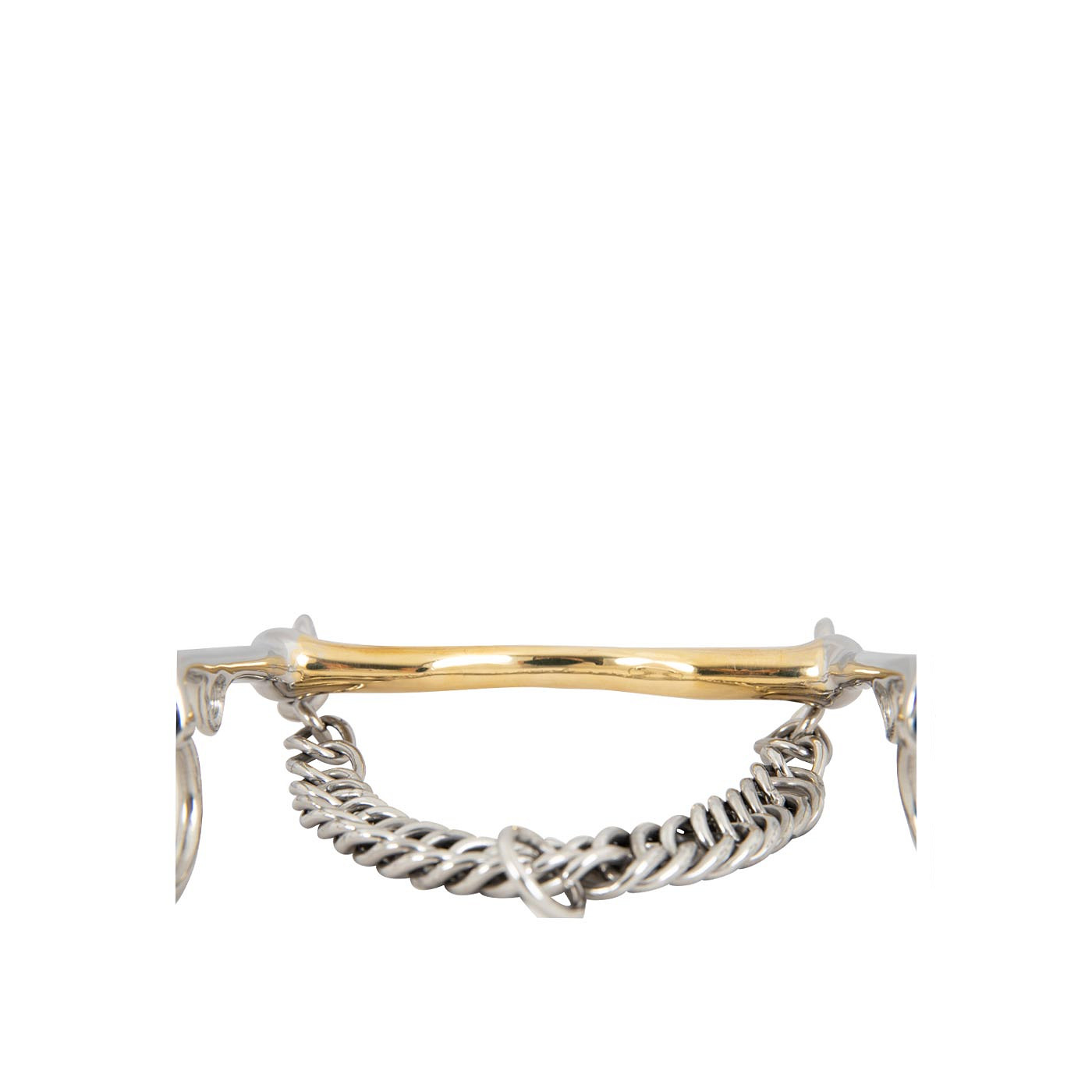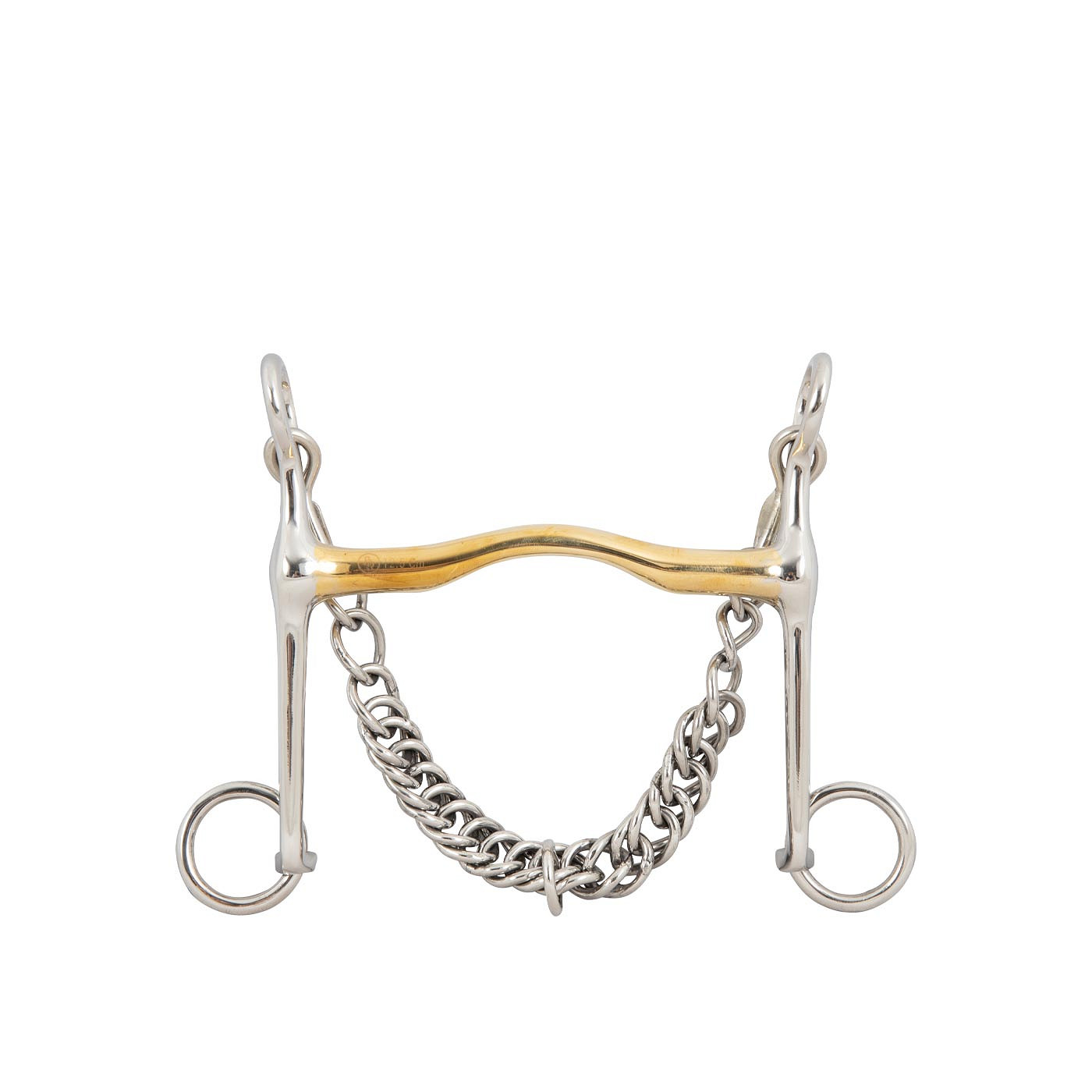 This high-quality Weymouth curb bit, featuring a low port that offers some tongue relief and fixed cheeks, is made of solid Cuprigan with stainless steel cheeks. Cuprigan is an alloy consisting of 89% copper, 7% aluminium, 3% iron and 1% zinc. The oxidation process of the material gives a pleasant smell and taste. The anatomical design of the bit follows the shape of the horse’s mouth, which allows for a gentle and even pressure distribution. The design, combined with the unique properties of Cuprigan, encourages the chewing process and saliva production, which allows for a pleasant connection with the sensitive horse’s mouth. The bit applies sharp pressure on the mouth. Mouthpiece thickness 12 mm, shank length 140 mm. Curb chain included.?