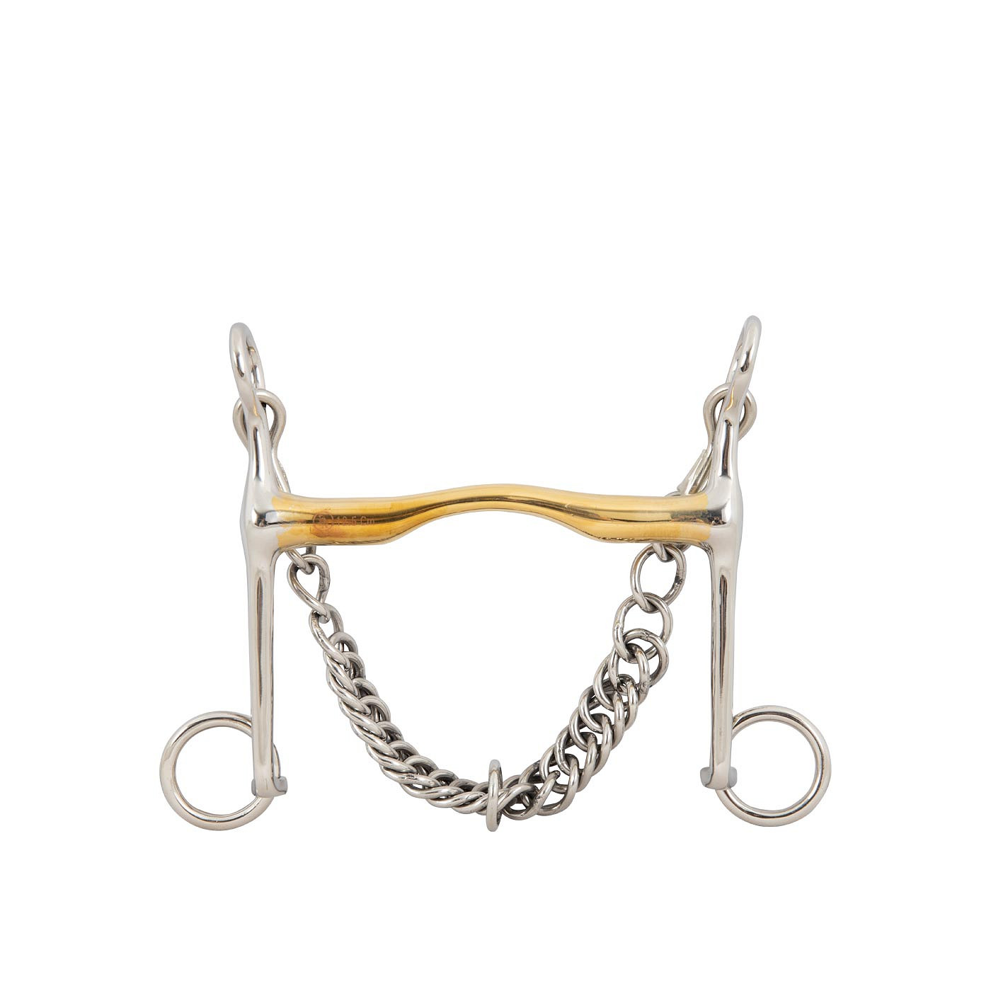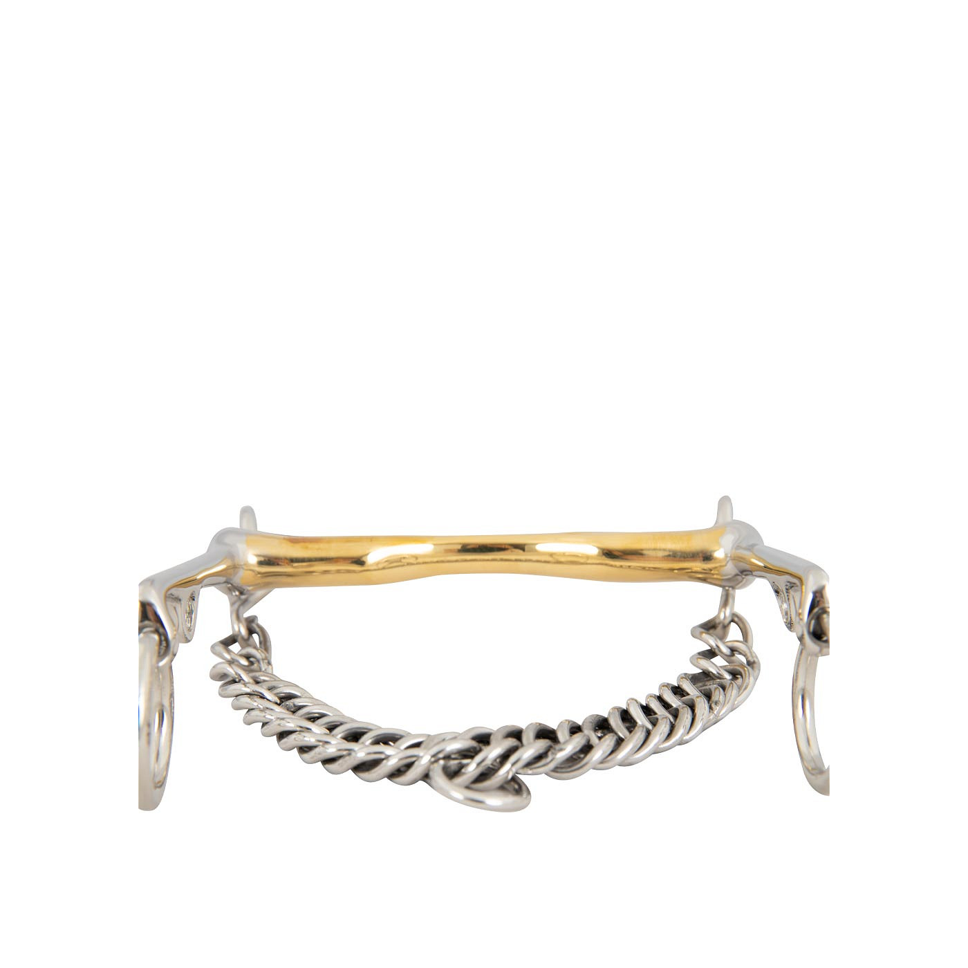 This high-quality Weymouth curb bit, featuring a low port that offers some tongue relief and fixed cheeks, is made of solid Cuprigan with stainless steel cheeks. Cuprigan is an alloy consisting of 89% copper, 7% aluminium, 3% iron and 1% zinc. The oxidation process of the material gives a pleasant smell and taste. The anatomical design of the bit follows the shape of the horse’s mouth, which allows for a gentle and even pressure distribution. The design, combined with the unique properties of Cuprigan, encourages the chewing process and saliva production, which allows for a pleasant connection with the sensitive horse’s mouth. The bit applies sharp pressure on the mouth. Mouthpiece thickness 14 mm, shank length 140 mm. Curb chain included.?