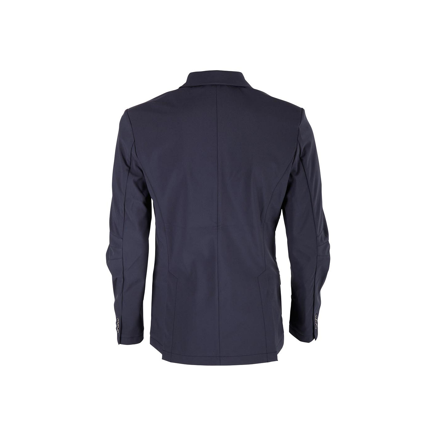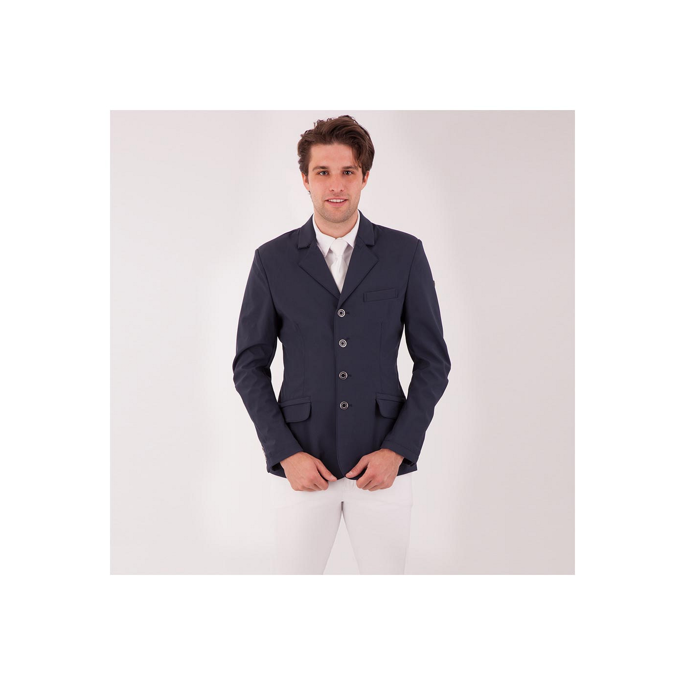 Stylish mens competition jacket made of soft shell. This material is moisture regulating and water repellent. The light, elastic material and the preformed sleeves provide a very comfortable fit. The jacket features a chest pocket and four synthetic BR buttons at the front. The cuffs have been fitted with similar buttons in a smaller size. The jacket features two riding slits at the back. Interchangeable collar and flap pockets are what makes this jacket unique. With an easy zip-off system and concealed zips. Machine washable at 30°C.