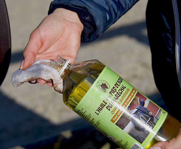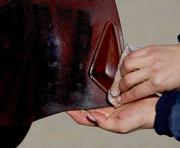 – Clean the leather with the glycerin soap, then apply the oil with a brush or sponge, let it dry, and polish.