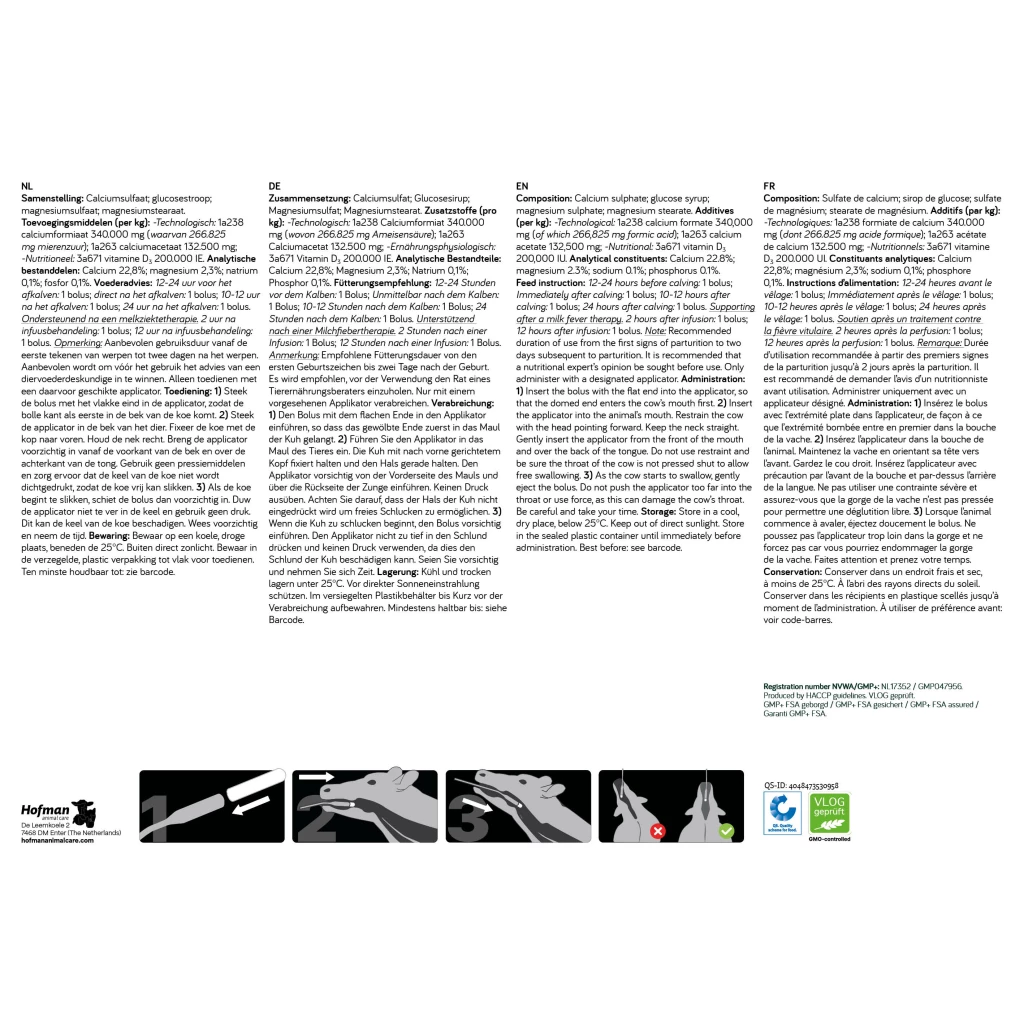 The DairyCalc Bolus Profi is an effective combination of 49 grams of calcium (30 g fast-acting, 19 g long-acting), 5 grams of magnesium and 43,000 IU Vitamin D3. Perfect for use in dairy cows around calving to reduce the risk of milk fever and subclinical hypocalcaemia. The DairyCalc Bolus Profi is a complementary feed (mineral dietetic feed). Easy to administer with Inserter Stainless Steel 36 mm (INSE020).