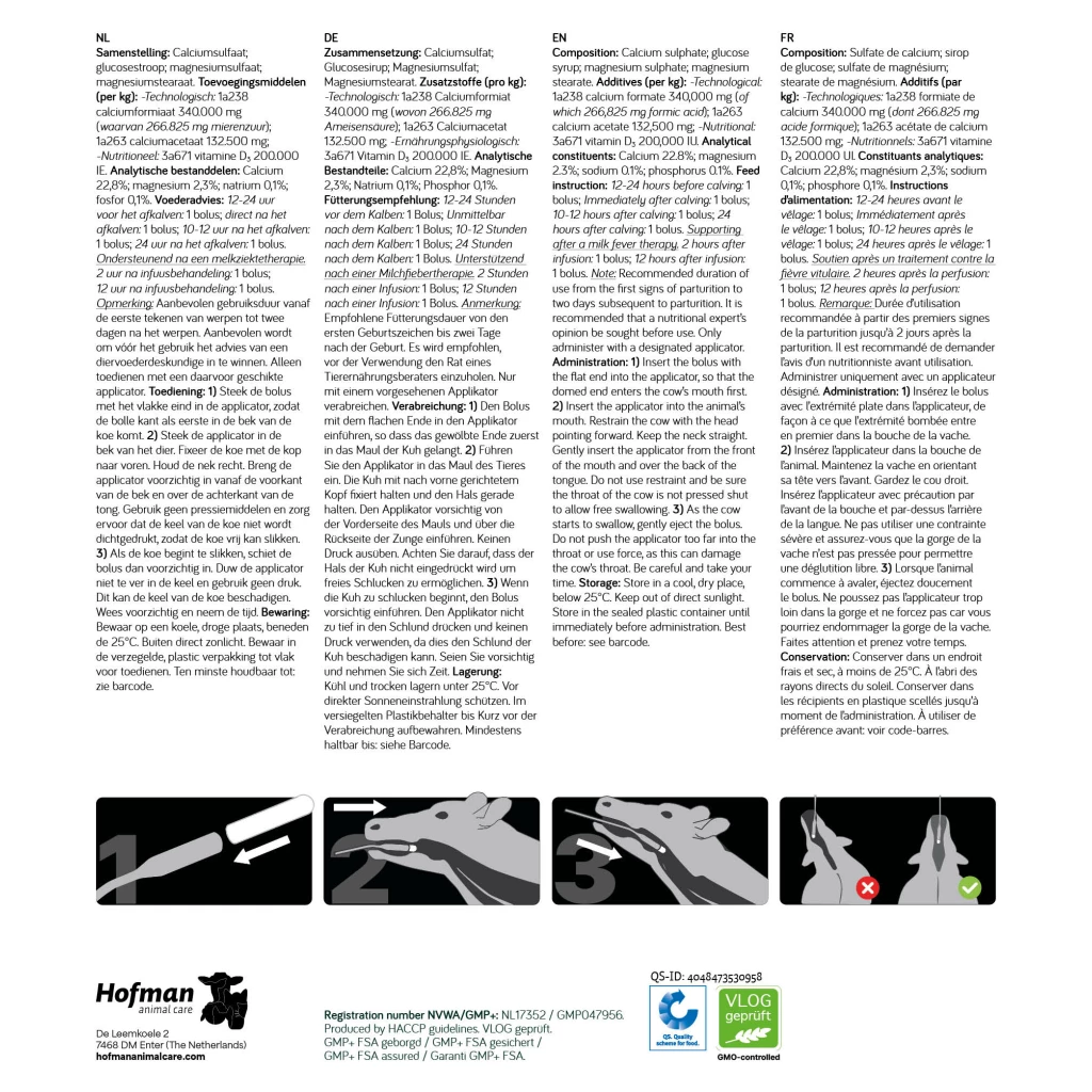 The DairyCalc Bolus Profi is an effective combination of 49 grams of calcium (30 g fast-acting, 19 g long-acting), 5 grams of magnesium and 43,000 IU Vitamin D3. Perfect for use in dairy cows around calving to reduce the risk of milk fever and subclinical hypocalcaemia. The DairyCalc Bolus Profi is a complementary feed (mineral dietetic feed). Easy to administer with Inserter Stainless Steel 36 mm (INSE020).