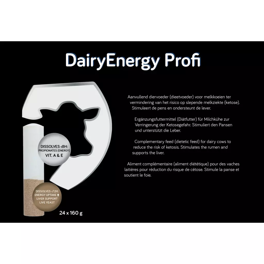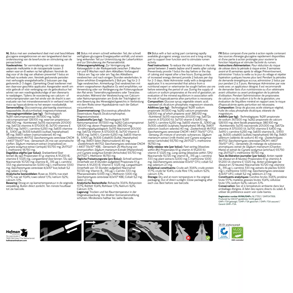 The DairyEnergy Bolus is a bolus with a fast-acting part containing rapidly available glucogenic energy sources (propionates) and a long-acting part including live yeast, plant extracts, vitamins, trace elements and amino acids to support liver function and stimulate rumen activity. Herewith, it provides multiple support to reduce the risk of ketosis.