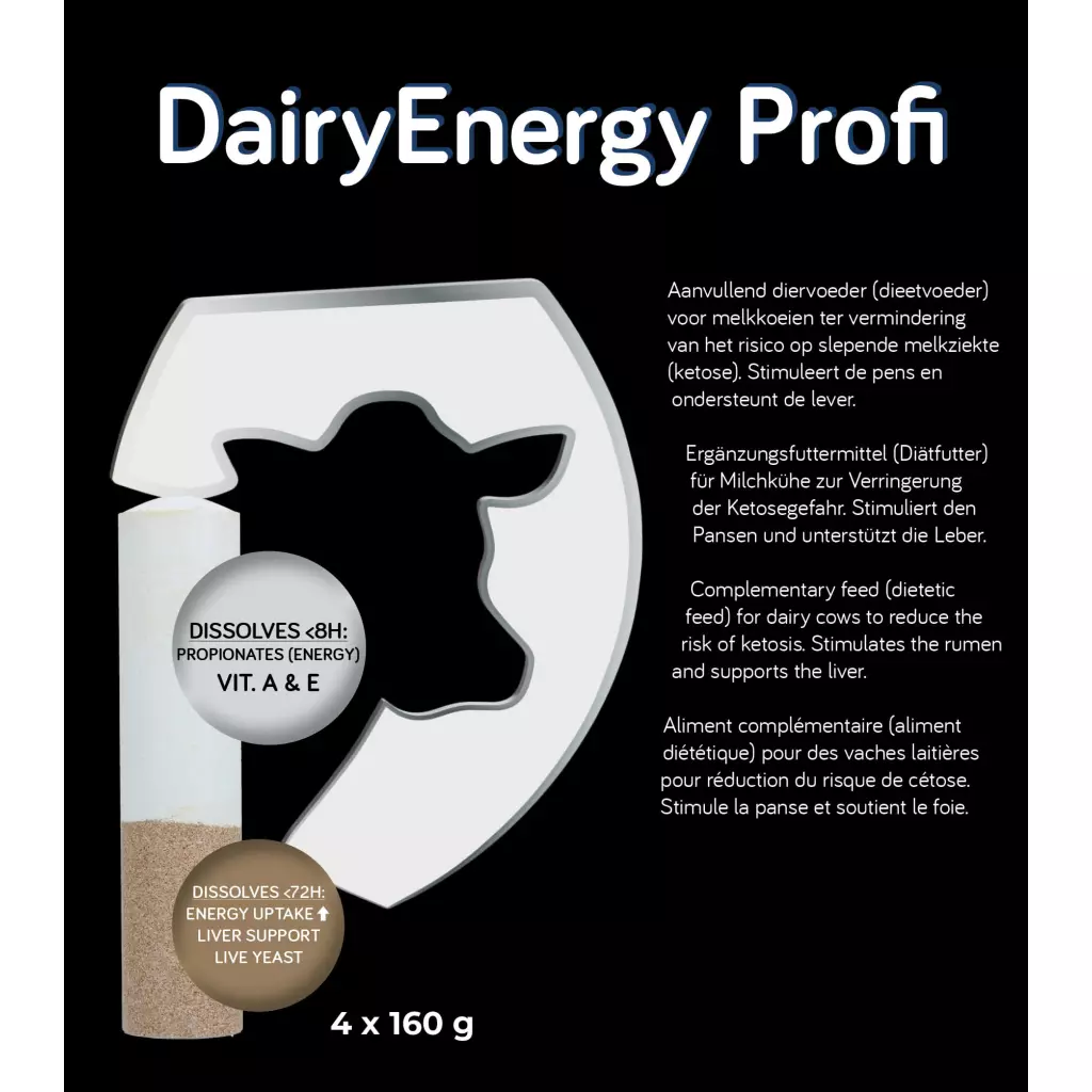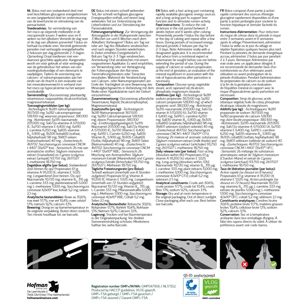 The DairyEnergy Bolus is a bolus with a fast-acting part containing rapidly available glucogenic energy sources (propionates) and a long-acting part including live yeast, plant extracts, vitamins, trace elements and amino acids to support liver function and stimulate rumen activity. Herewith, it provides multiple support to reduce the risk of ketosis.