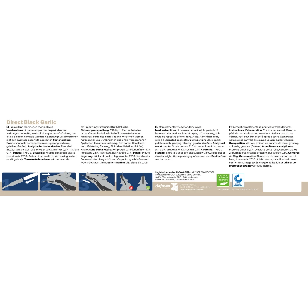 The Direct Black Garlic Bolus is a complementary feed for dairy cattle that has been specially developed to keep livestock healthy and resilient. The Black Garlic Bolus promotes the animals’ natural defense system and supports the maintenance of good udder health by using the special properties of specific plants and herbs.