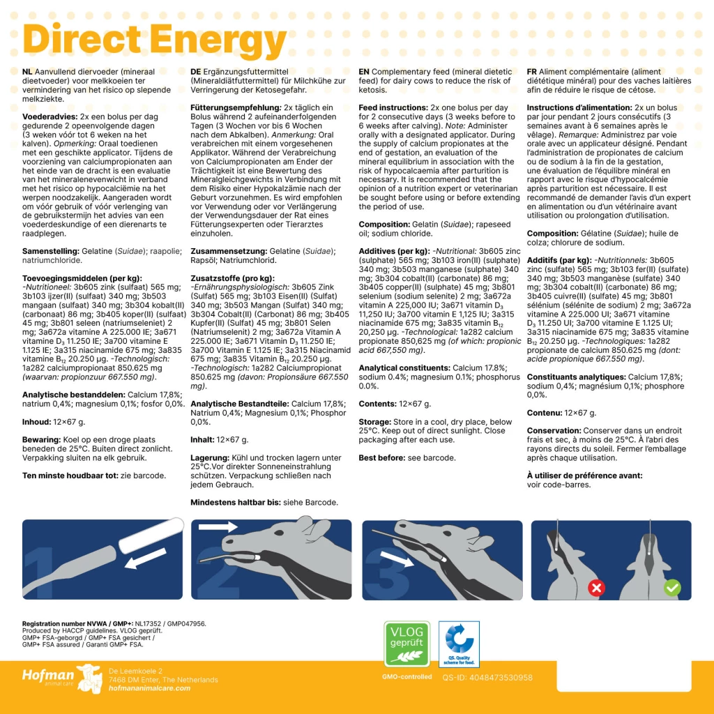 Direct Energy Bolus is a complementary feed (mineral dietetic feed) for dairy cows that is designed to address the root cause of negative energy balance and therefore achieve quick results. The bolus is specifically developed to reduce the risk of ketosis, a condition caused by a lack of energy.