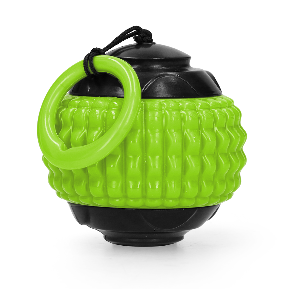 Grab the ring on the string, spin around and throw the ball far away. The string rolls up into the ball by itself. The ridges in the rubber massage the gums and help to clean the teeth.