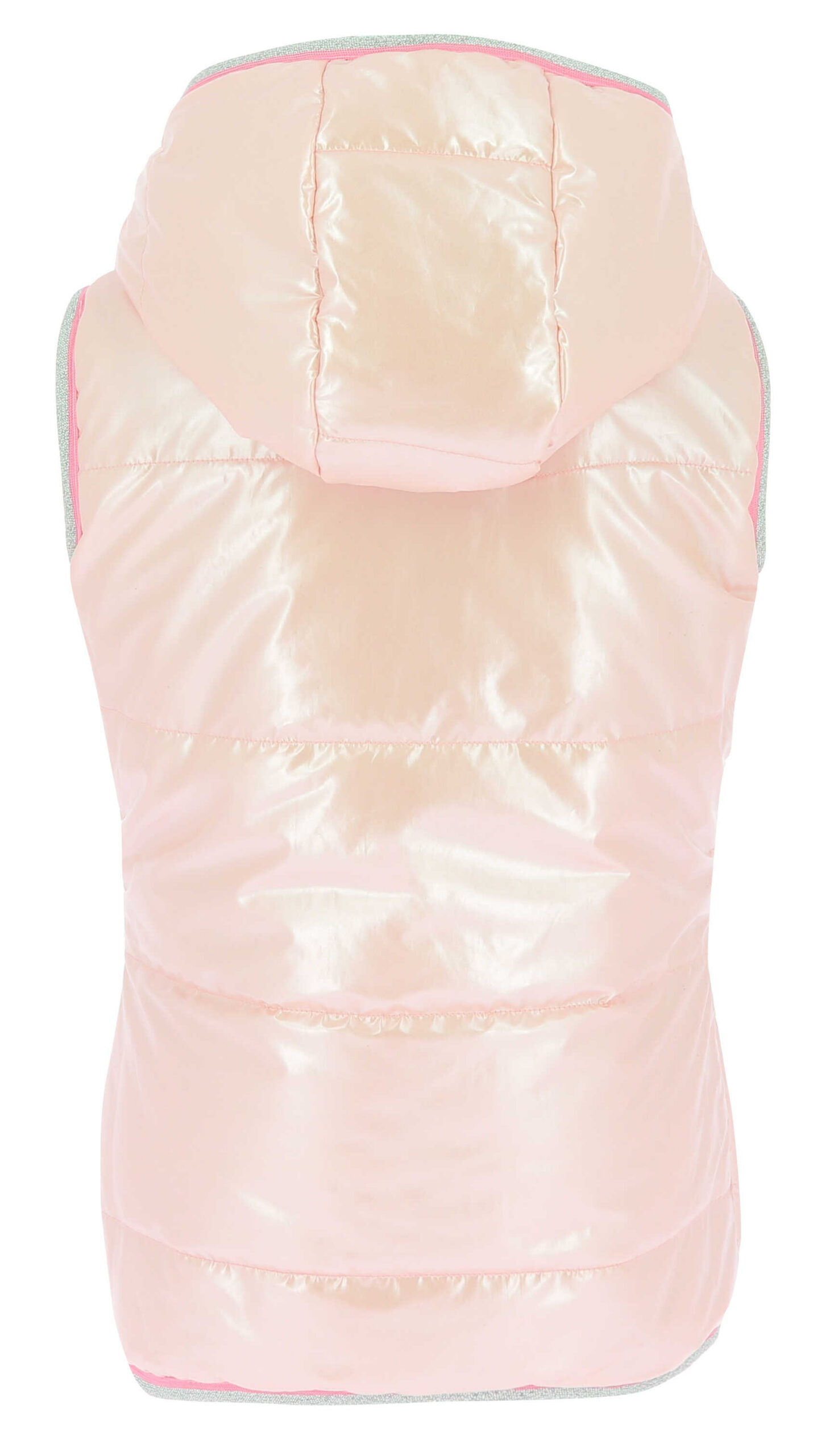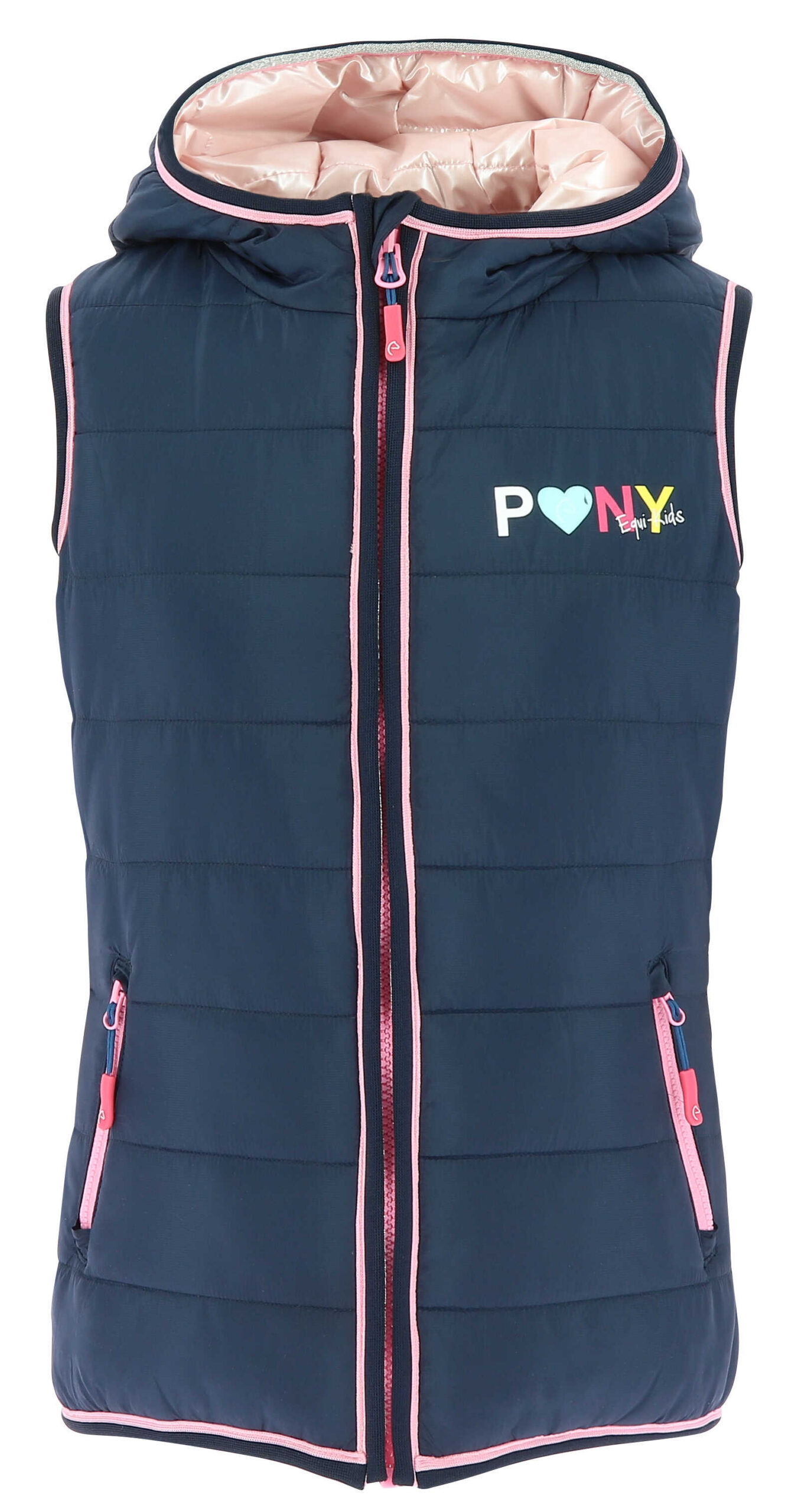 Reversible quilted hooded vest, water-repellent and warm. PonyLove branding on both sides. Hand pockets on the navy side. Elasticated binding around the hood and at the bottom of the jacket for better protection against the cold. Composition: 100% polyester. Machine washable at 30°C, no tumble dry, no ironing.