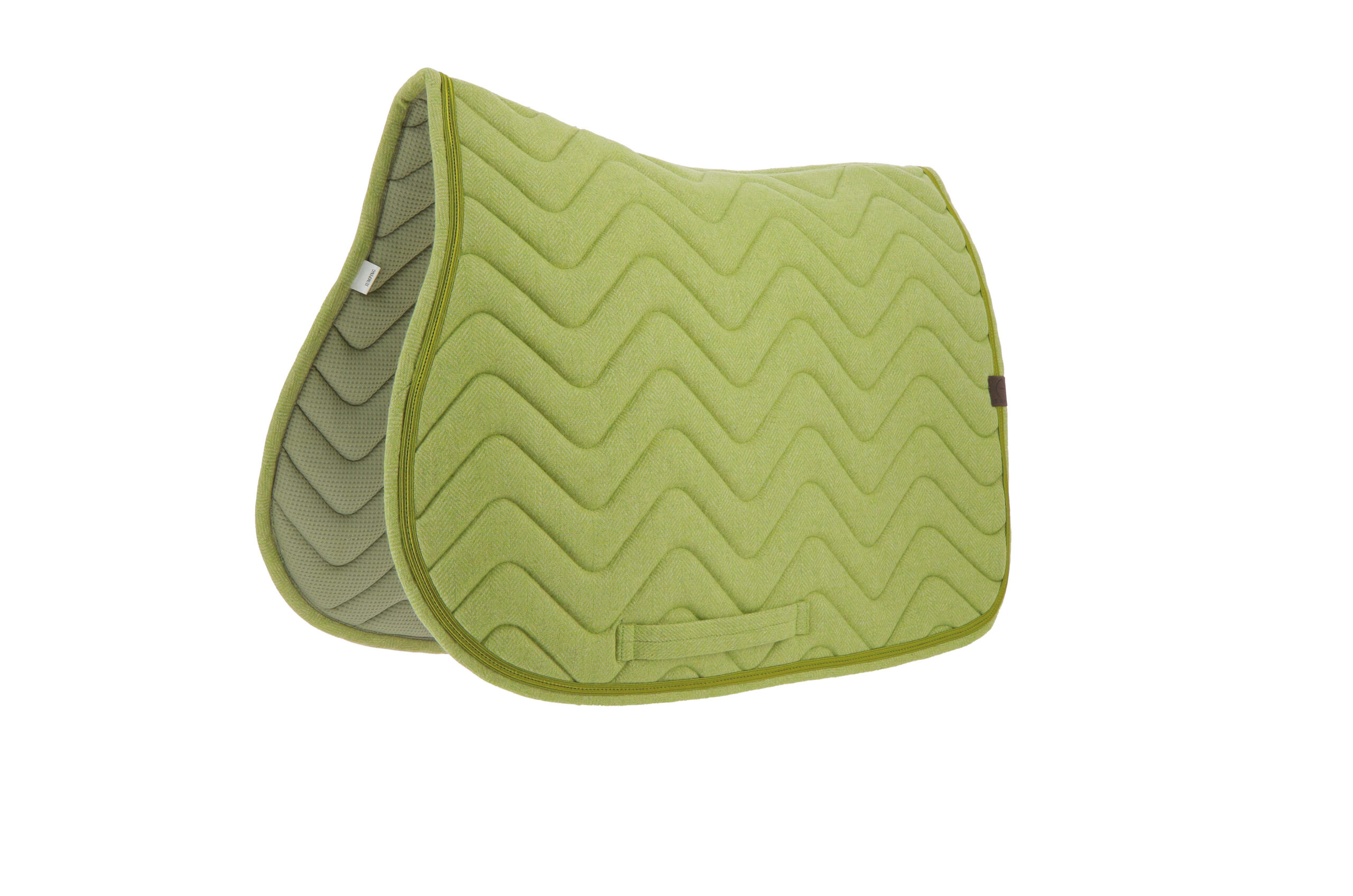 Saddle pad made of 50% polyester and 50% wool with velvet trim. 8 mm wavy quilting. 300g/m² polyfill. Leather appliqué with logo on the left side. Girth loops. Highly breathable Coolmax padding. Machine wash at 30°C, do not tumble dry.