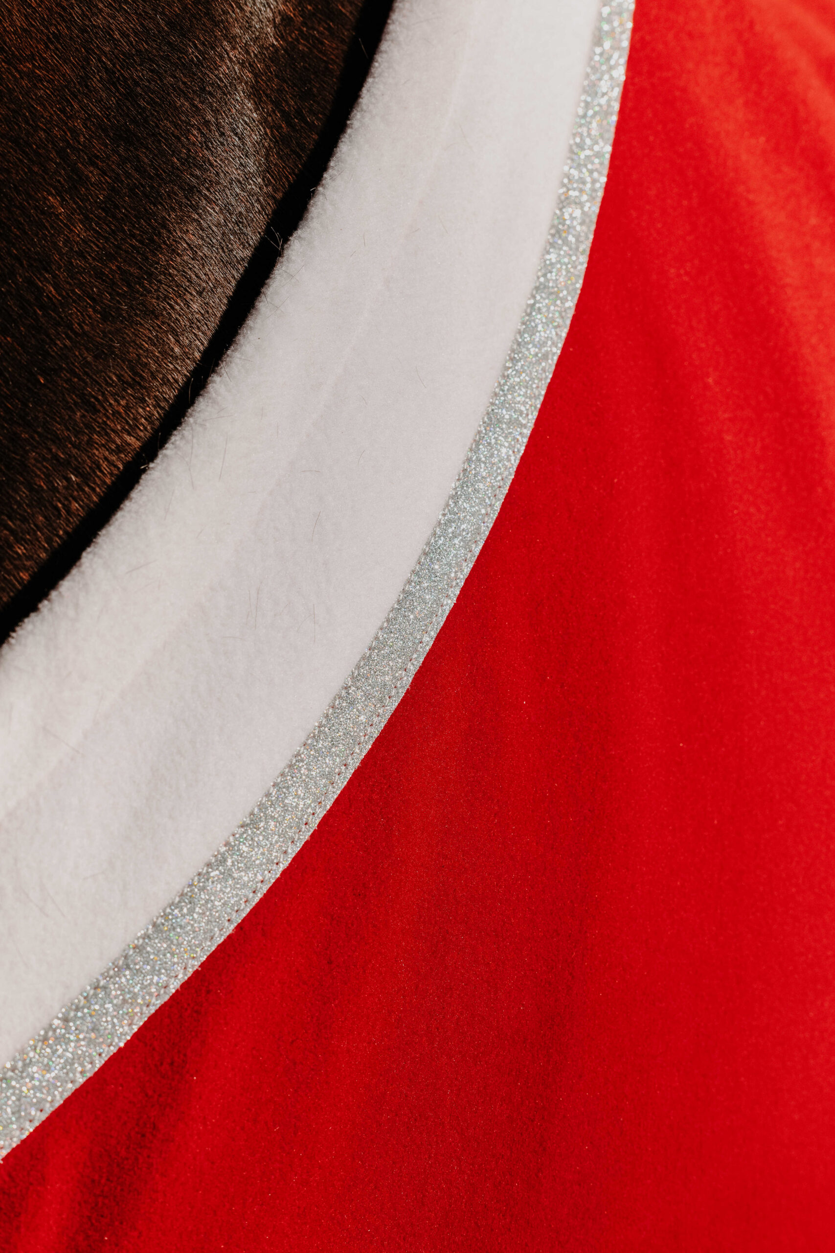 Pidulik ja soe fliistekk, mis toob jõulumeeleolu talli või võistlusele. Sobib ideaalselt hobuse kuivatamiseks peale treeningut või transportimise ajal soojas hoidmiseks. Punane värv koos valge ääristuse ja sädelevate detailidega loob tõelise jõuluilme.