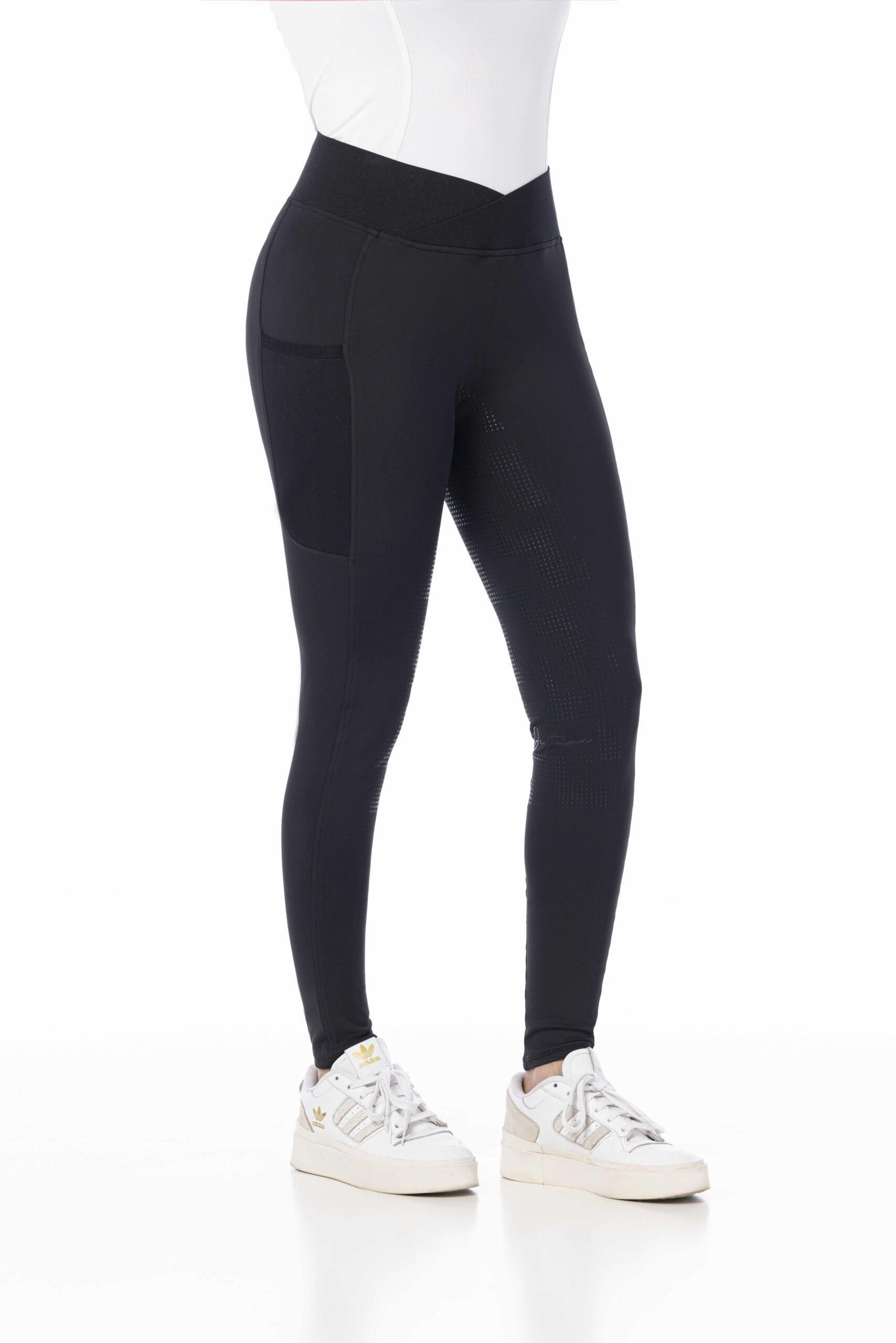 Riding leggings with a crossed waistband.- Stretch and comfortable: Lightweight and breathable fabric.- Original design: Wide, crossed “Tulip” waistband.DETAILS:- Silicone bottom.- Phone pocket on each side.- “Je t’aime” rhinestone branding on the side of the pants.COMPOSITION:Main material: 78% polyester, 22% elastane.Waistband: 75% polyamide, 25% elastane.