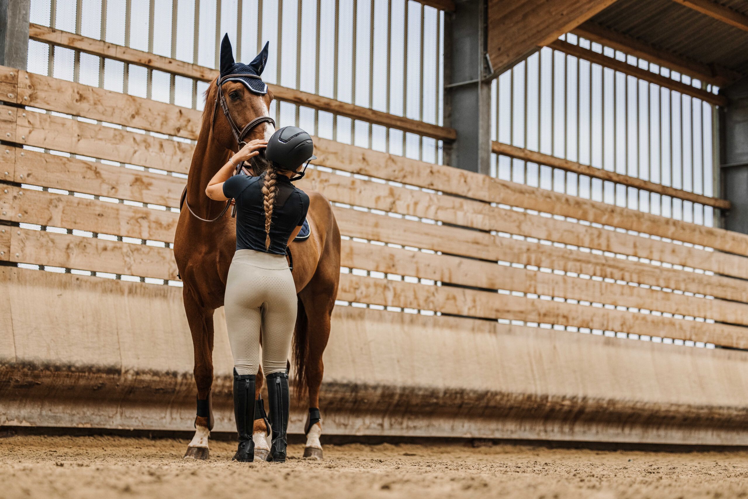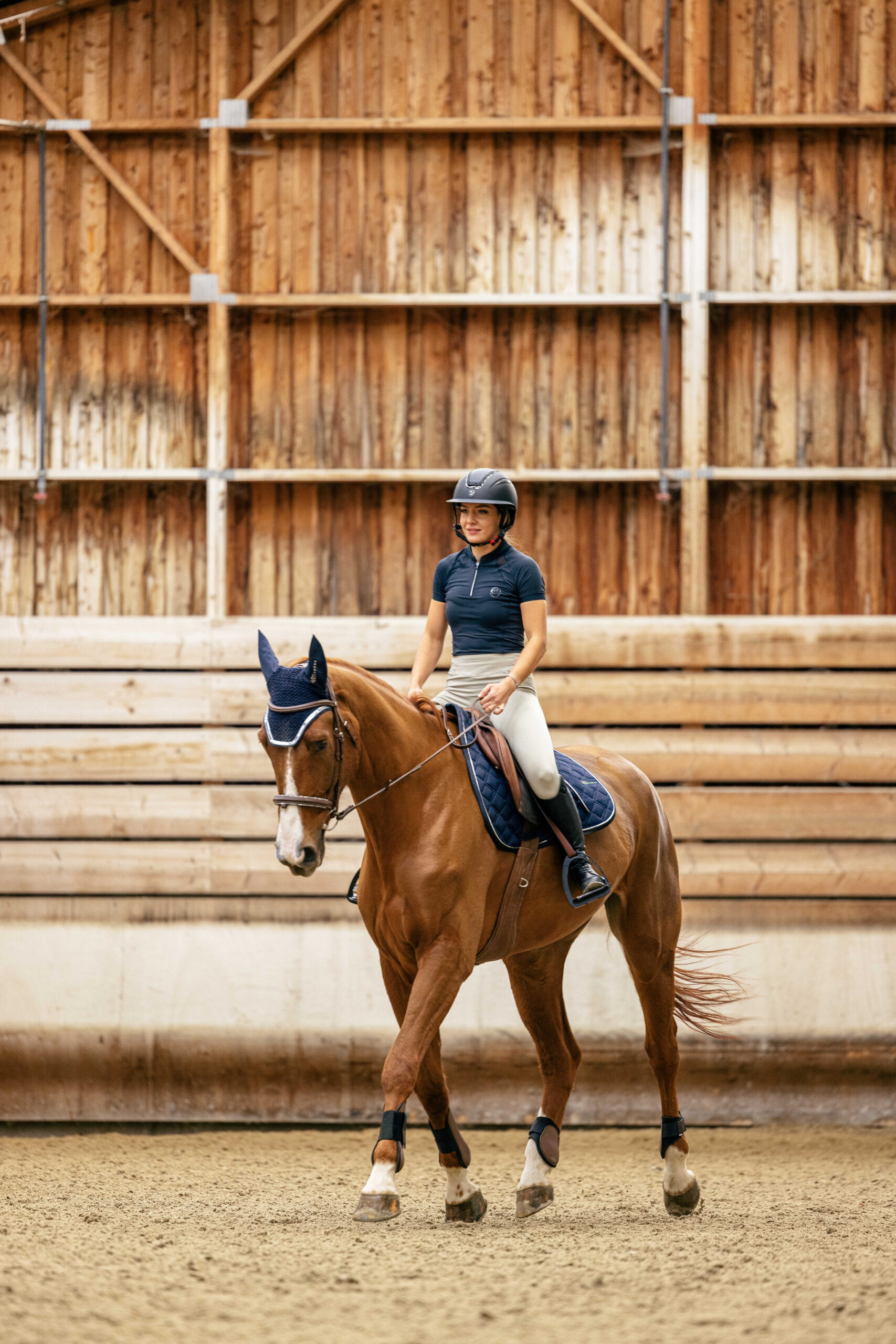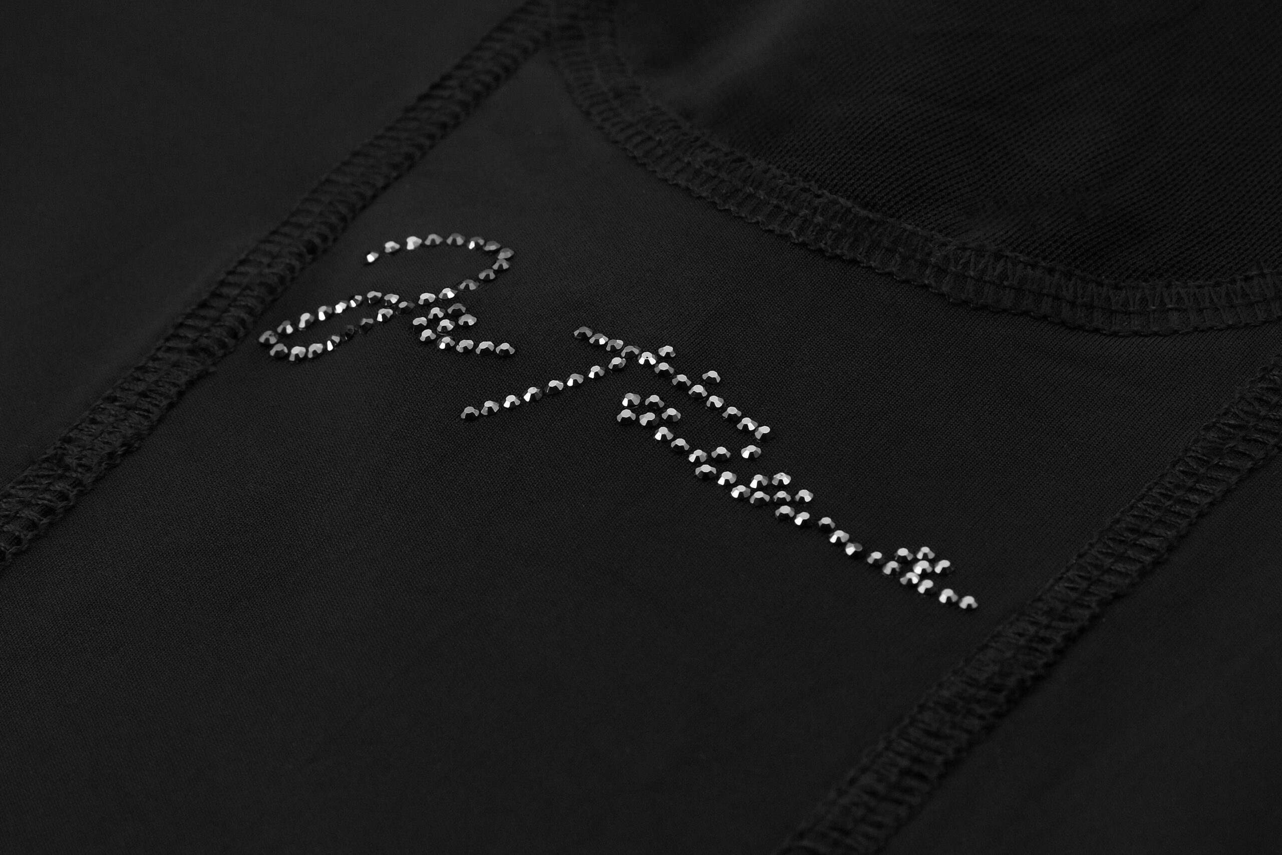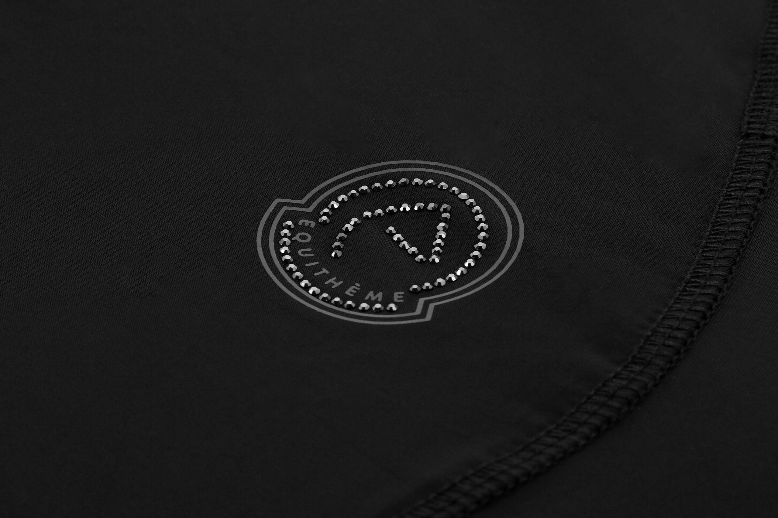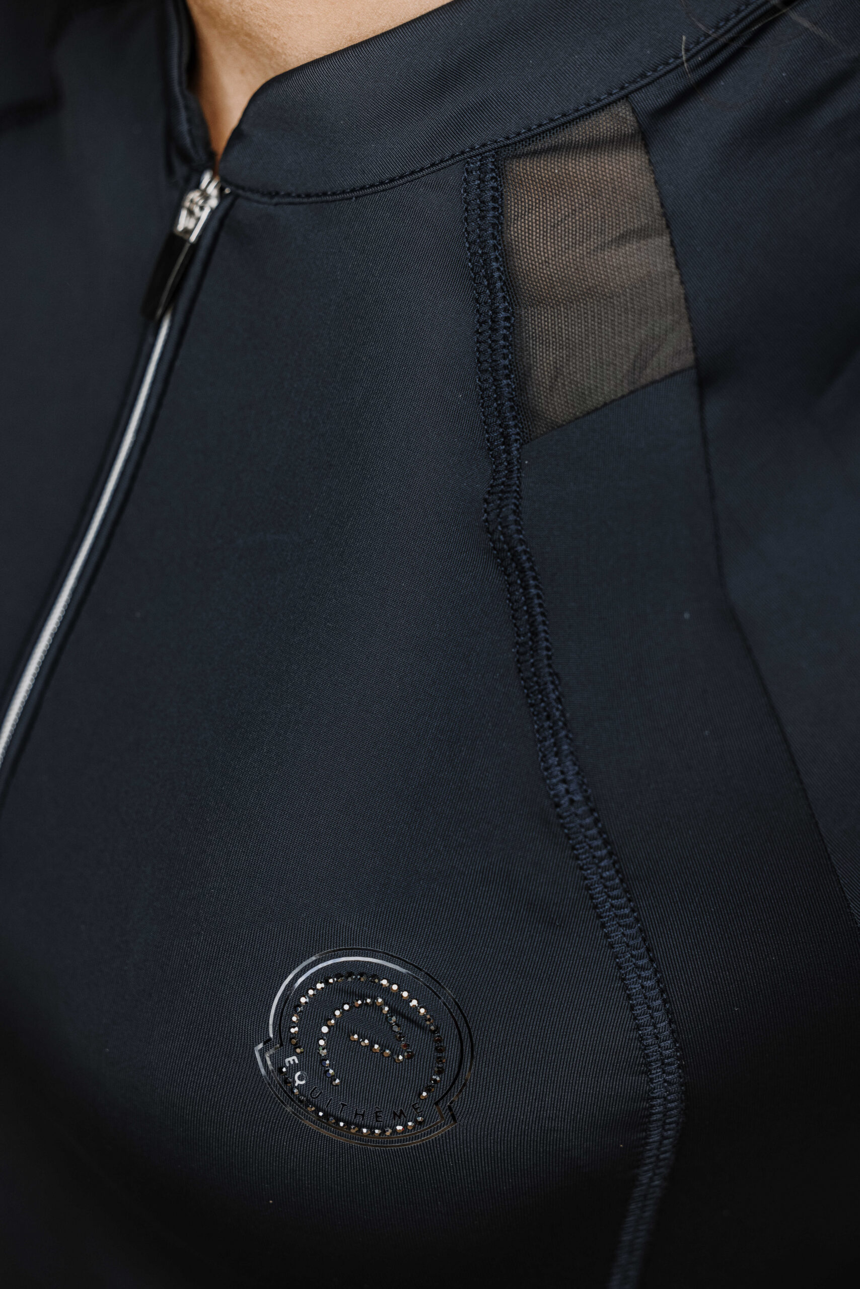 – Zip opening at the collar, fitted cut, and contrasting decorative piping with rhinestone logo.