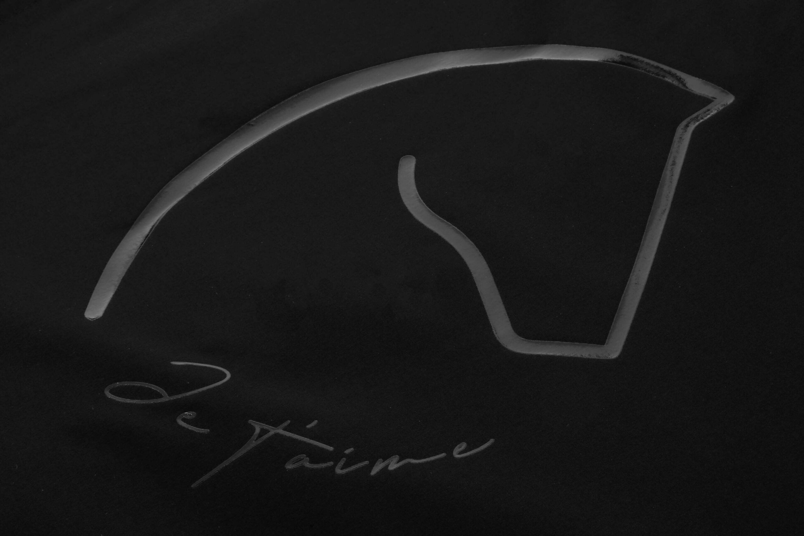 – Black “Je t’aime” badge with rhinestones on the chest and a tone-on-tone silicone logo on the back.