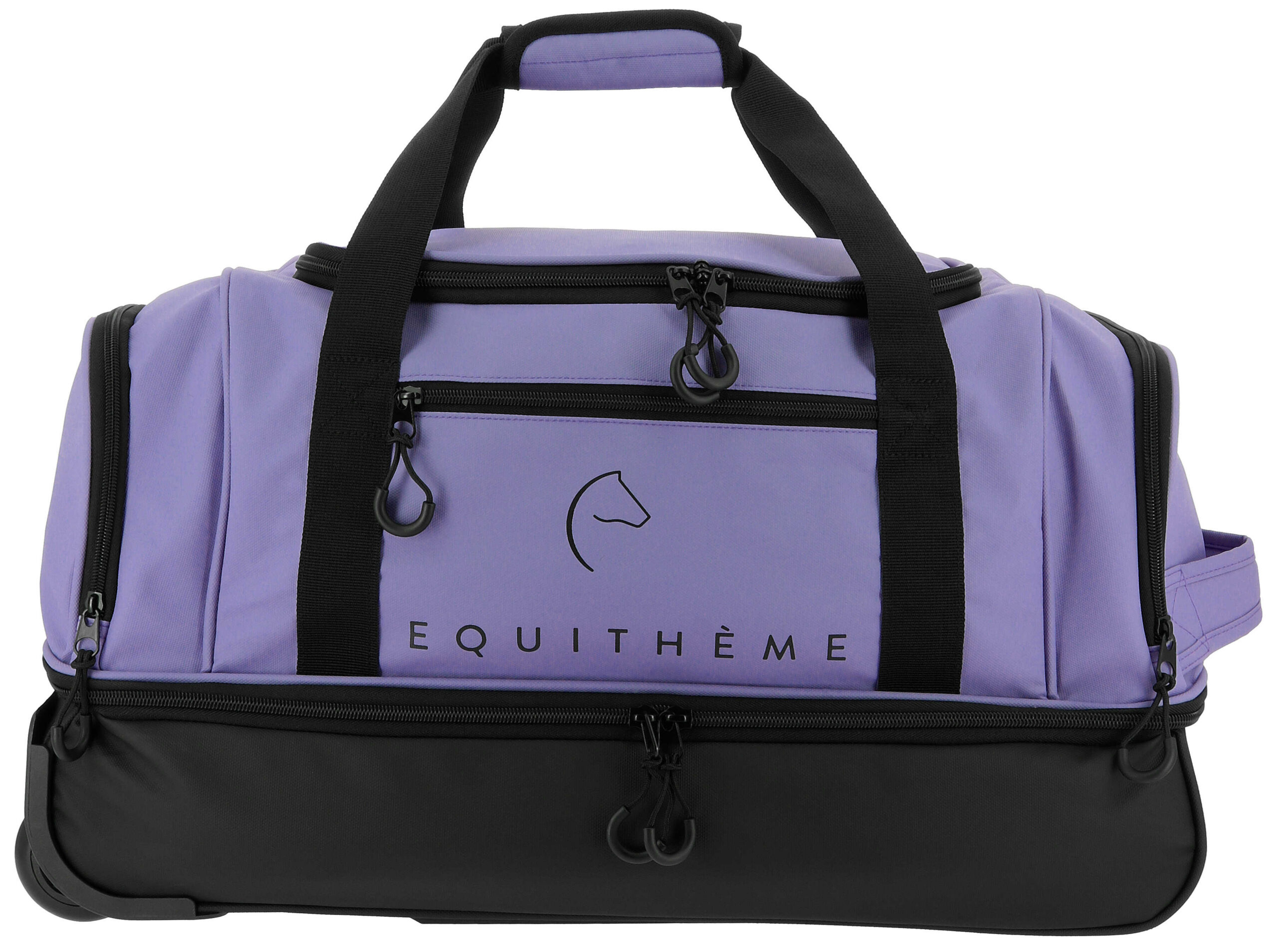 – Purple zipper pullers on the black bag and black pullers on the purple bag, with a black Equithème logo.