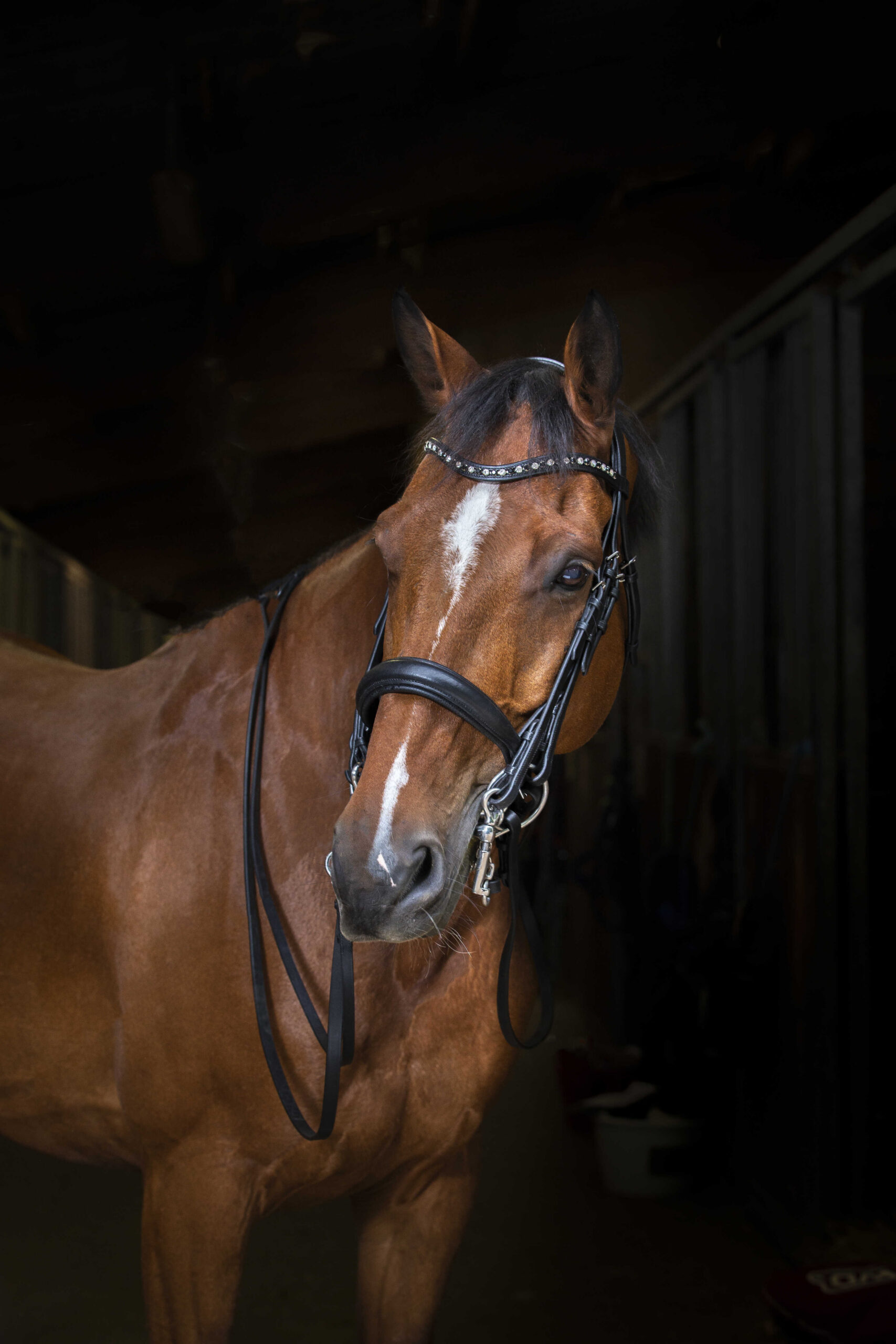 Buffalo leather bridle with soft Clarino lining under the headpiece and noseband. V-shaped browband decorated with black and clear rhinestones. Curb and snaffle cheek pieces with hook closures at the bottom. Black stitching, stainless steel buckles. Reins not included.
