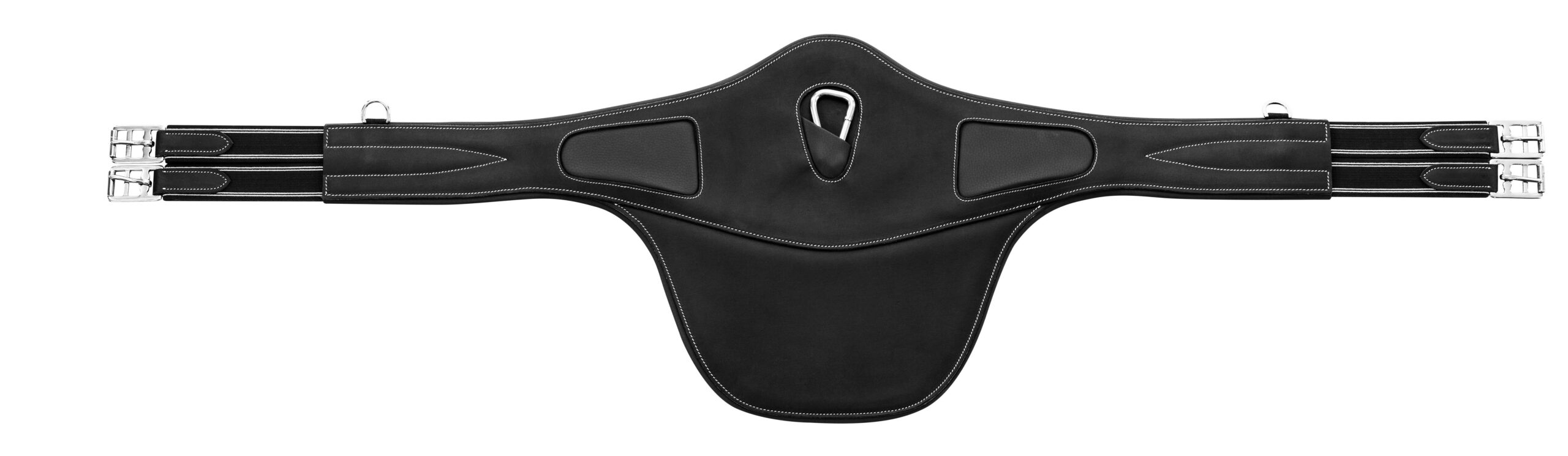 Fully padded saddle girth with Clarino microfiber lining and stud protection. Featuring two side rings and a central snap hook with a protective cap. Stainless steel roller buckles on both sides and triple-layer elastic straps.
