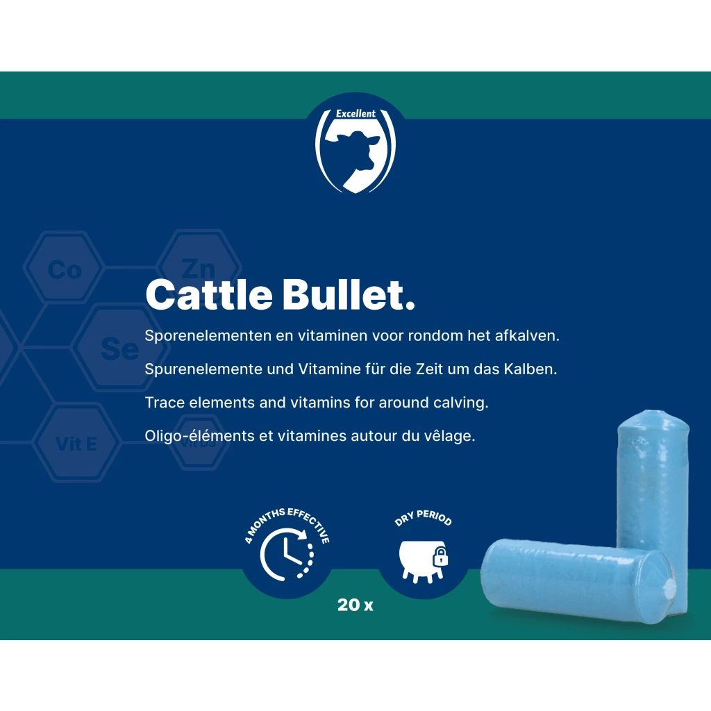 Cattle Bullet, also known as the dry period bolus, is a specially developed complementary feed (mineral dietetic feed) for grass-fed cattle. The bolus is intended for use during the period around calving and has a duration of action of 4 months. The feeding recommendation is 2 undamaged boluses per animal (from 150kg body weight).