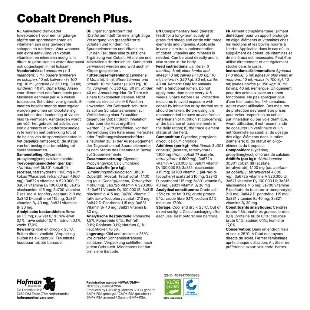 Cobalt Drench Plus is applicable for animals with a functional rumen. Cobalt Drench Plus is liquid and therefore dosable with the drench-gun. Cobalt Drench Plus covers the need for a longer period (2 to 4 months).