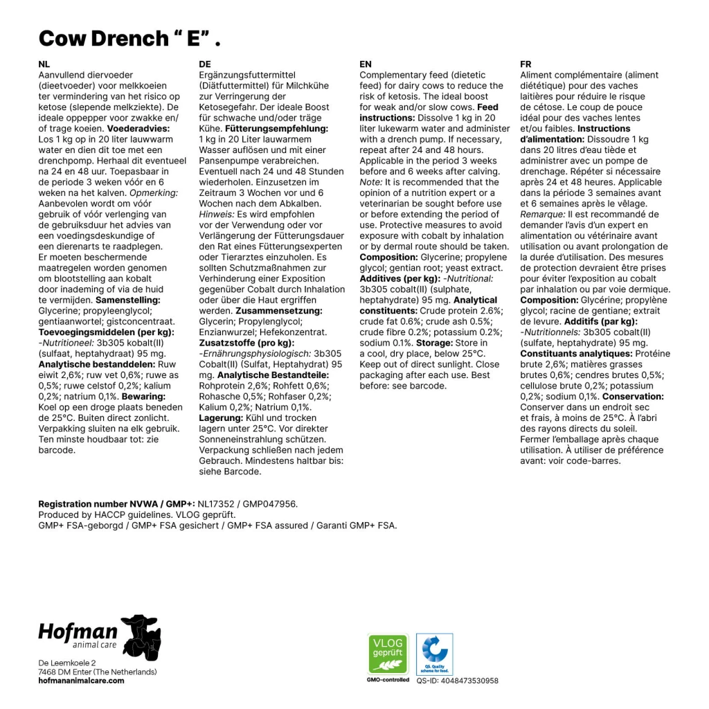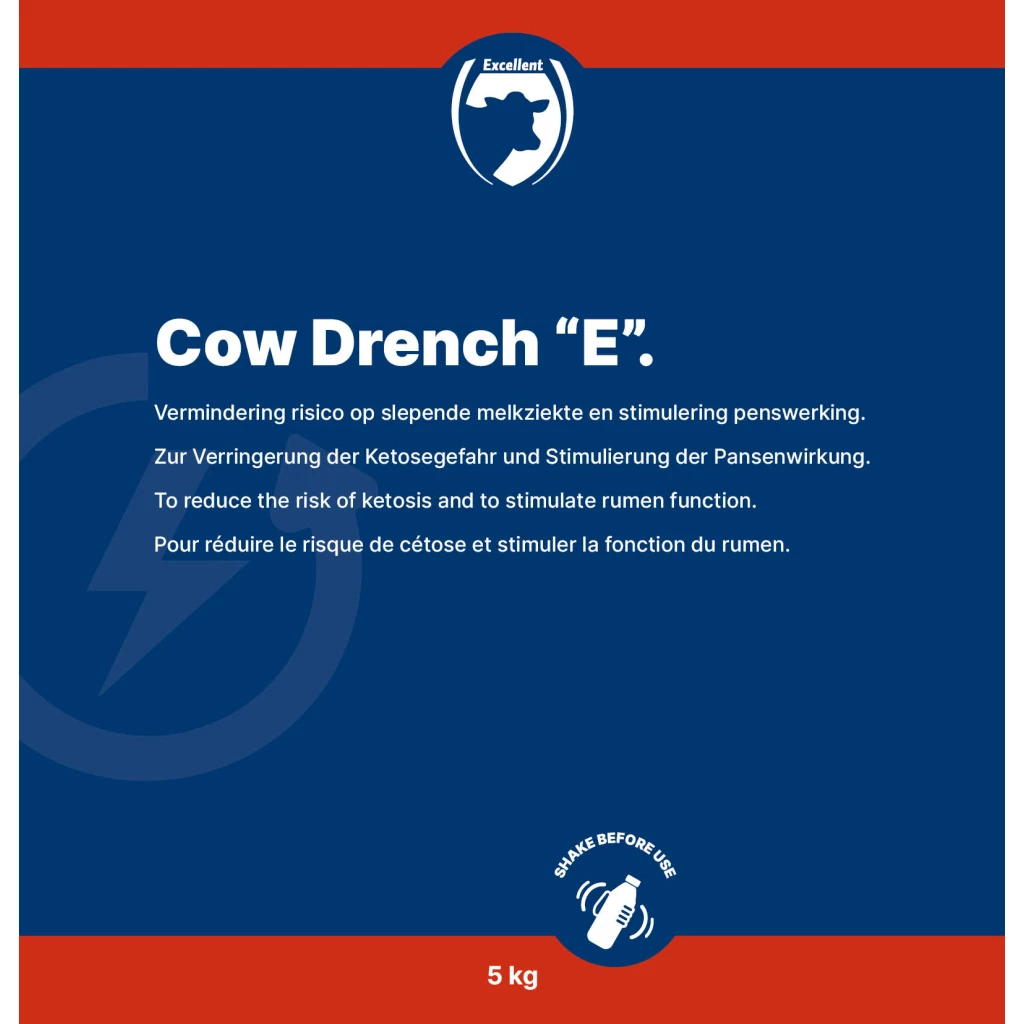 Dissolve 1 kg Cow Drench E in 20 ltr. lukewarm water. Drench the solution by using Cow Drencher (COWD000) or Drench Mate. If necessary repeat this dosage after 24 and 48 hours.